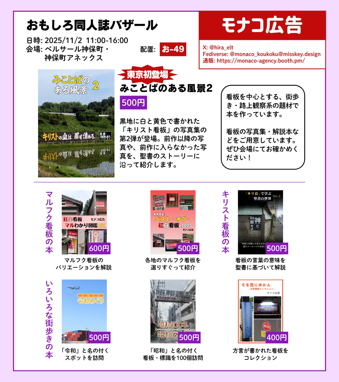 『令和6年令和めぐり』は、おもしろ同人誌バザール初登場。マルフク看板・キリスト看板・方言看板の本もございます。よろしくお願いいたします。