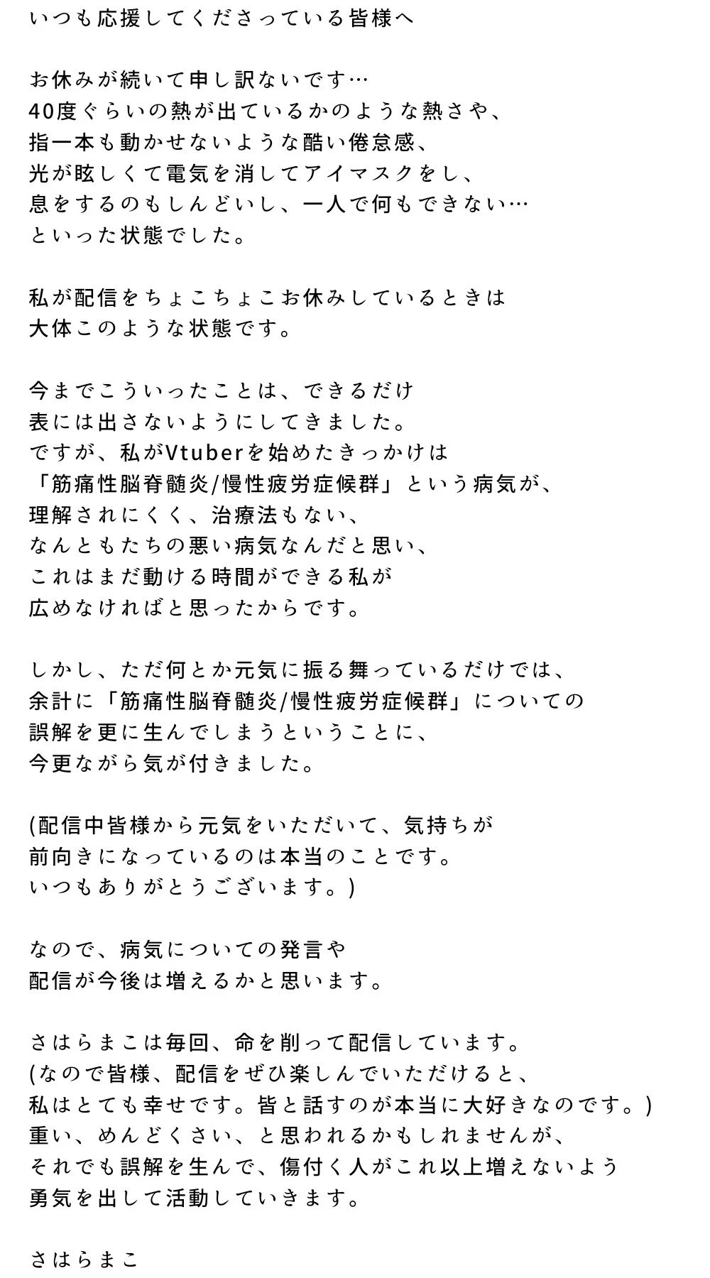筋痛性脳脊髄炎/慢性疲労症候群ではないかと診断されており、活動はゆっくりめ。