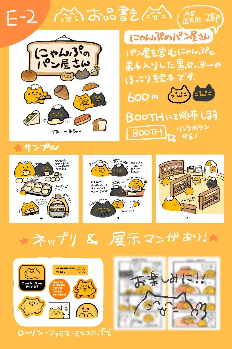 みすけっと【E-2】にて、にゃんぷっぷーのパン屋さんの絵本頒布&ネップリ&漫画の展示を行います。3枚目の画像がお店の目印です!お気軽にお立ち寄りください
