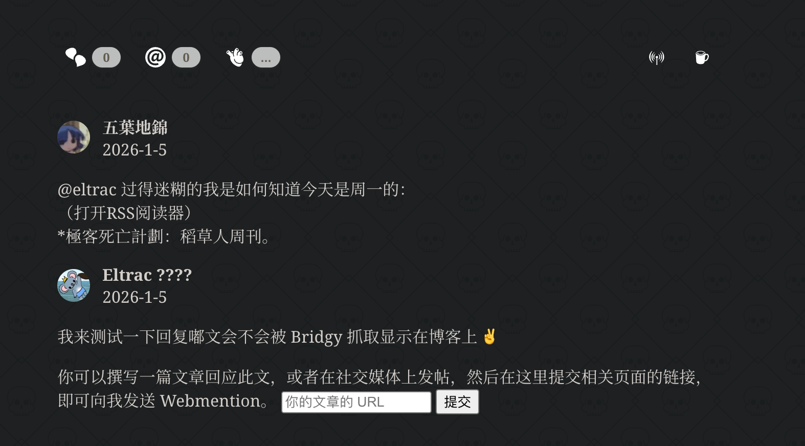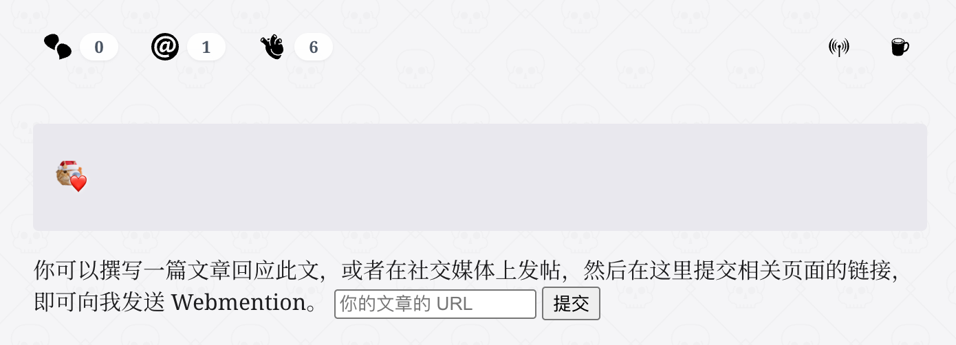 所以是有办法把 Mastodon 上的点赞变成 Webmention 回应显示在网站上的,回复应该也能同步,嗯……