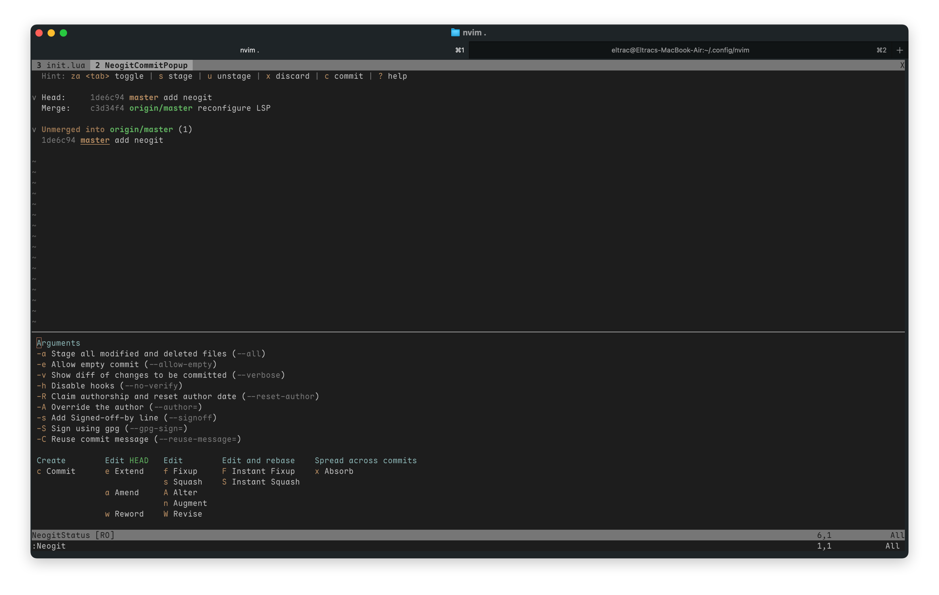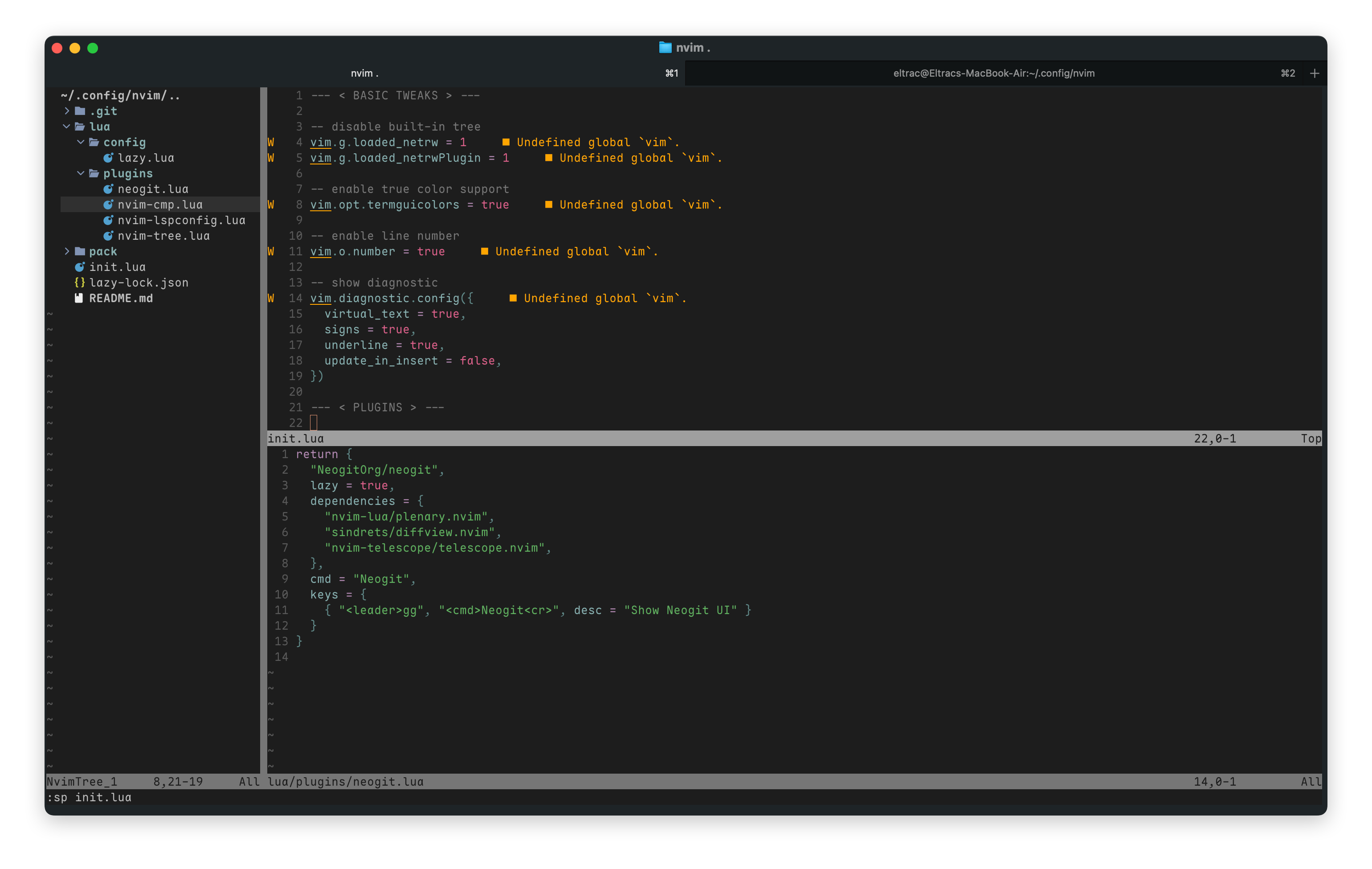 - 安装了 nvim-tree、nvim-lspconfig、nvim-cmp 和 neogit