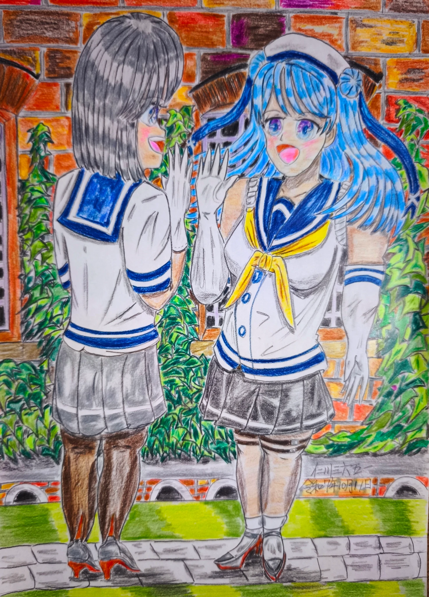 進水日翌日になりましたが、春雨さんを描きました。提督に「愛してる」のハンドサインを送った瞬間です😋😆