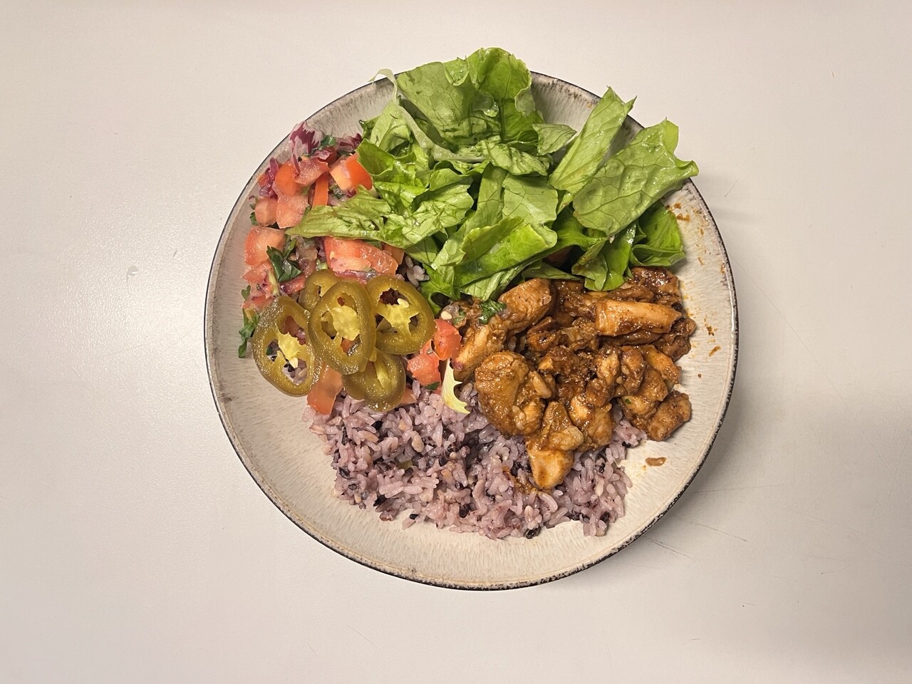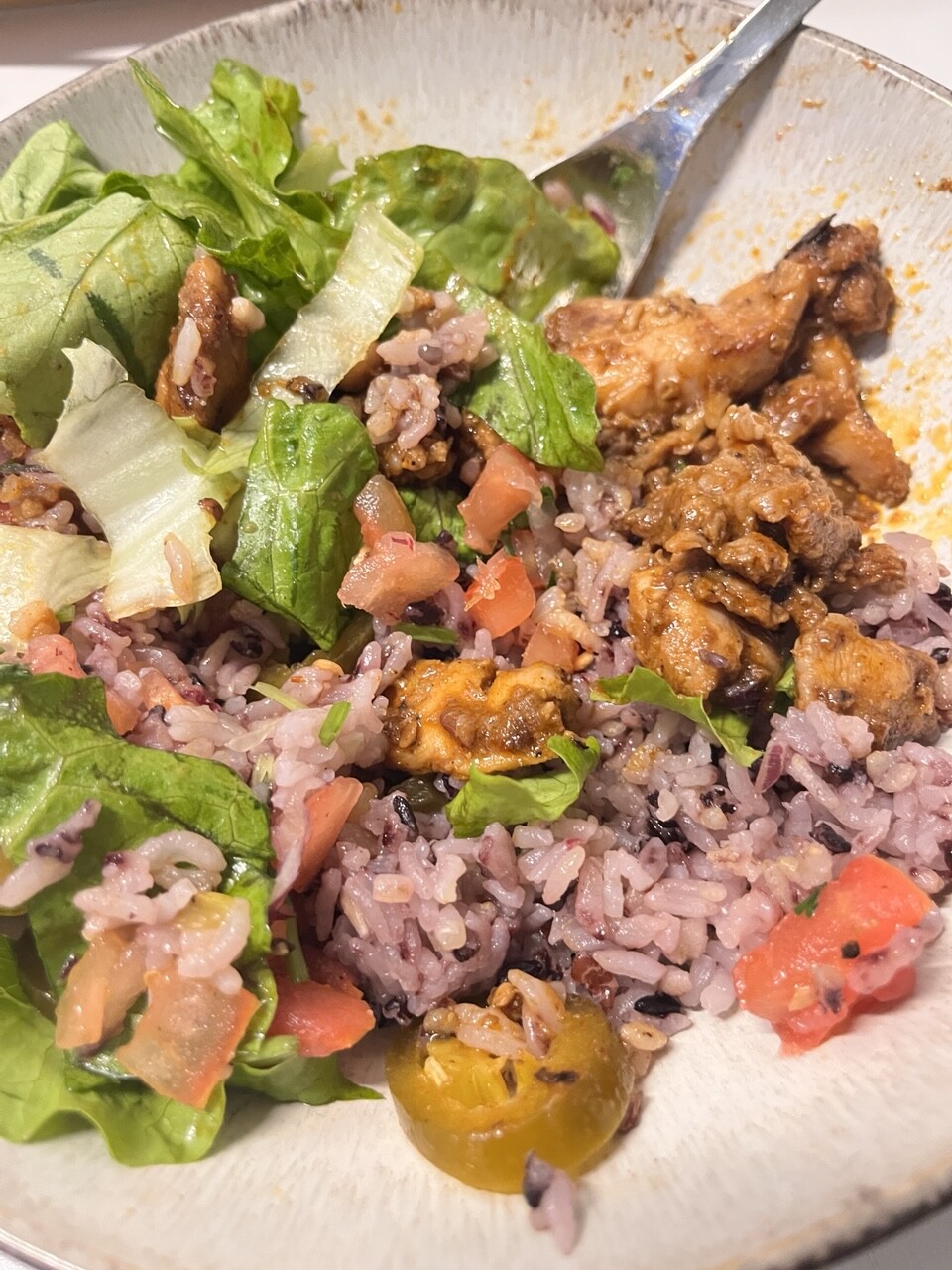 明天有事只敢吃温和版本,小青辣椒换成甜青椒,鸡肉之外我加了一颗茄子,有点像那么回事。第一勺菜糊入口,嚼到明显的姜的香味,有那么一点点觉得自己离印巴料理近了一点。