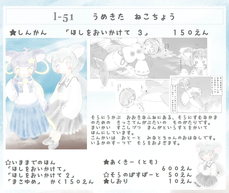 あしたの かんさいこみてぃあ75にて、 さーくる うめきたねこちょう は、そらのなかの きっさてんでくらす ねこまた・うちのこのほん、「ほしを おいかけて3」をだします。また、いままでのほんや あくりるきーほるだーなども あります。I-51に あそびにきていただければ うれしいです。 #関西コミティア #関西コミティア75
