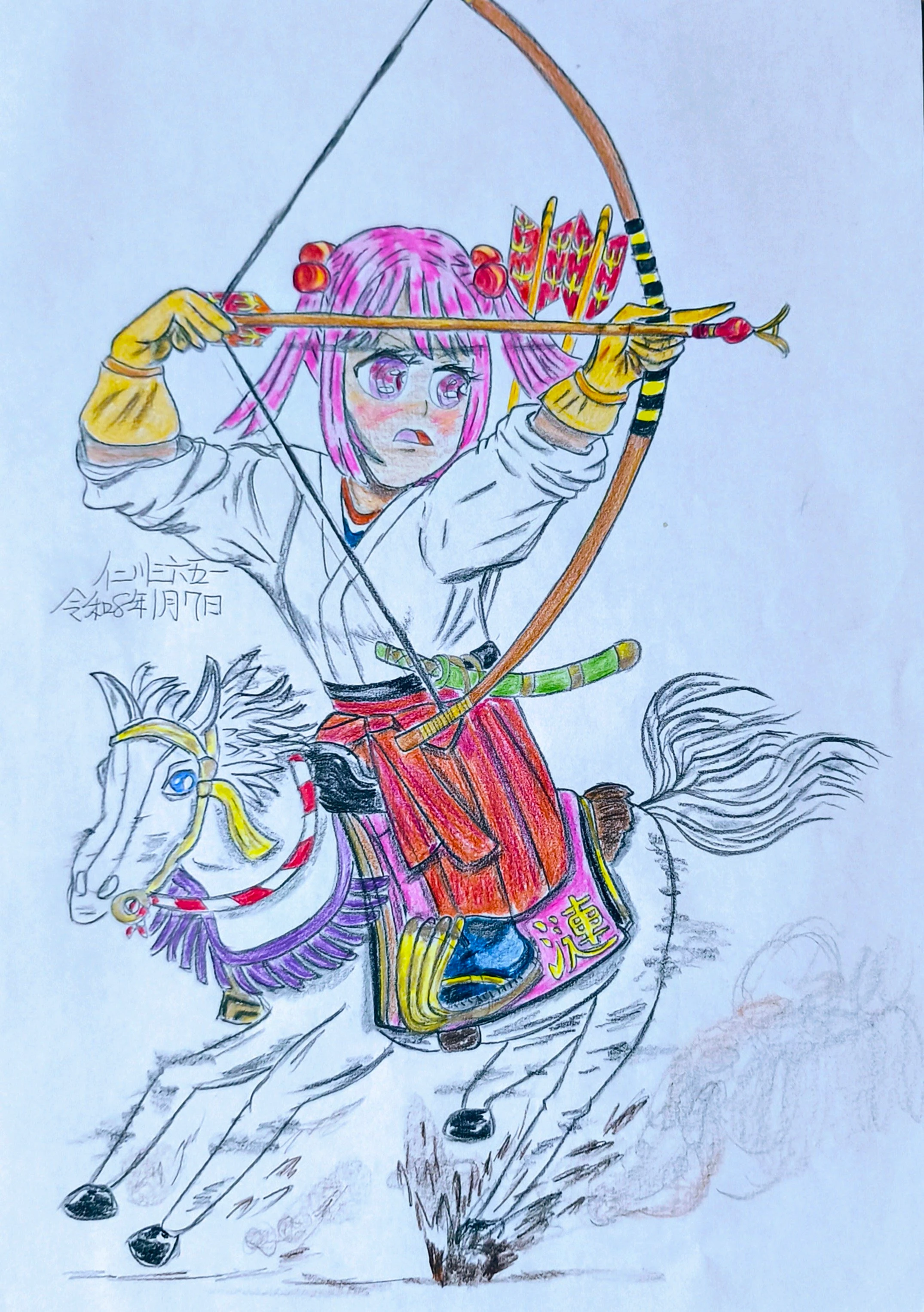先月、ある人の誕生日祝いに描いたイラストです。その人は艦隊これくしょんの漣さんが好きな人。流鏑馬を嗜む漣さんを描きました。確かこちらにはまだアップしていなかったはずなので…#艦これ #漣 #流鏑馬 #馬 #弓矢 #アナログイラスト #色鉛筆