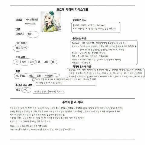 선호 고전 좋아하며(특히 90년대~2000년대 초반 작품) 1차(BL), 2차(주로 드림) 둘 다 하고 드림은 옛날부터 정말 여러 작품 드림을 해온 편인데 현재는 주로 진삼 순욱아야 드림, 도검난무 미카사니 드림(평행세계 다드림) 하고 있어요.