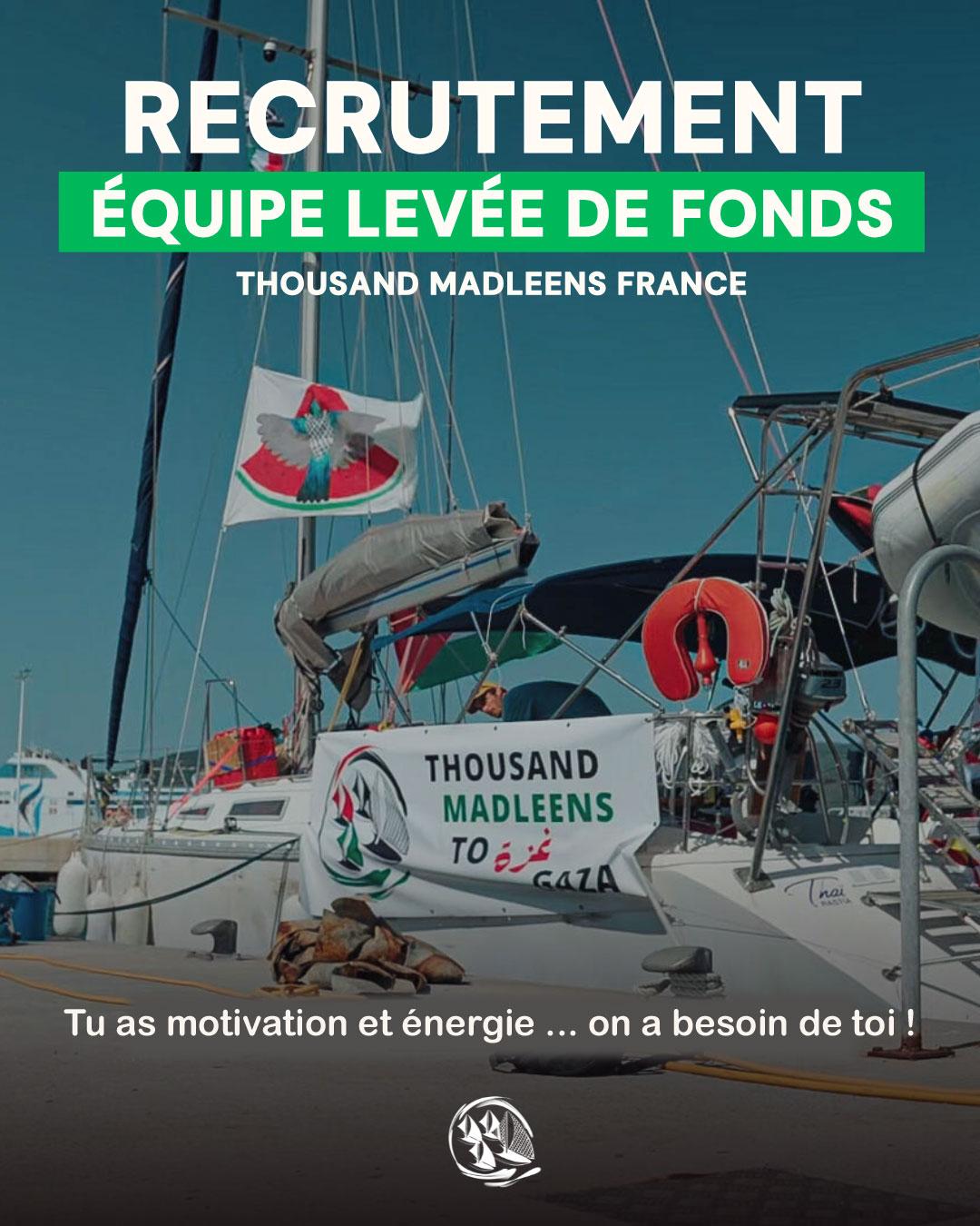 Nous agrandissons l’équipe nationale levée de fonds de Thousand Madleens to Gaza pour préparer la prochaine vague de flottilles. Pour cela, nous cherchons des profils capables de nous aider à organiser une levée de fonds conséquente : objectif 1,3 million d'euros ... et surtout plein de motivation et d'énergie !!