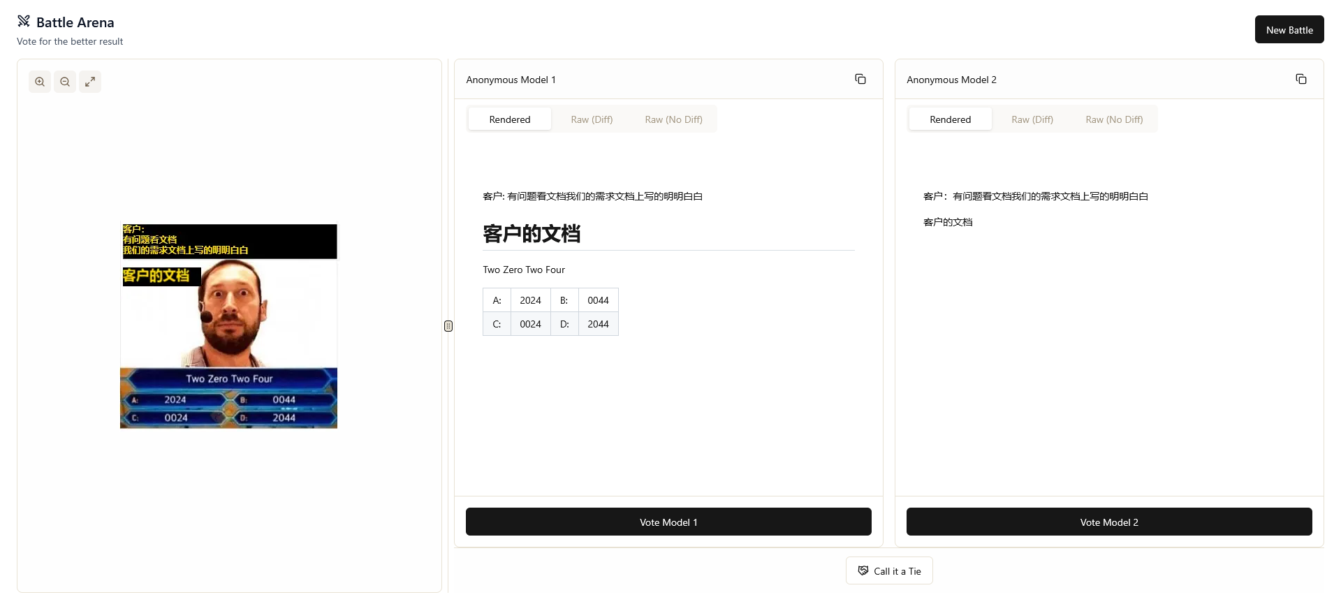 你可以在这里上传一张带有文字的图片,系统会随机选出 2 个大模型进行 OCR 文字提取,并且把提取结果展示出来,你可以查看两个模型提取结果的差异。