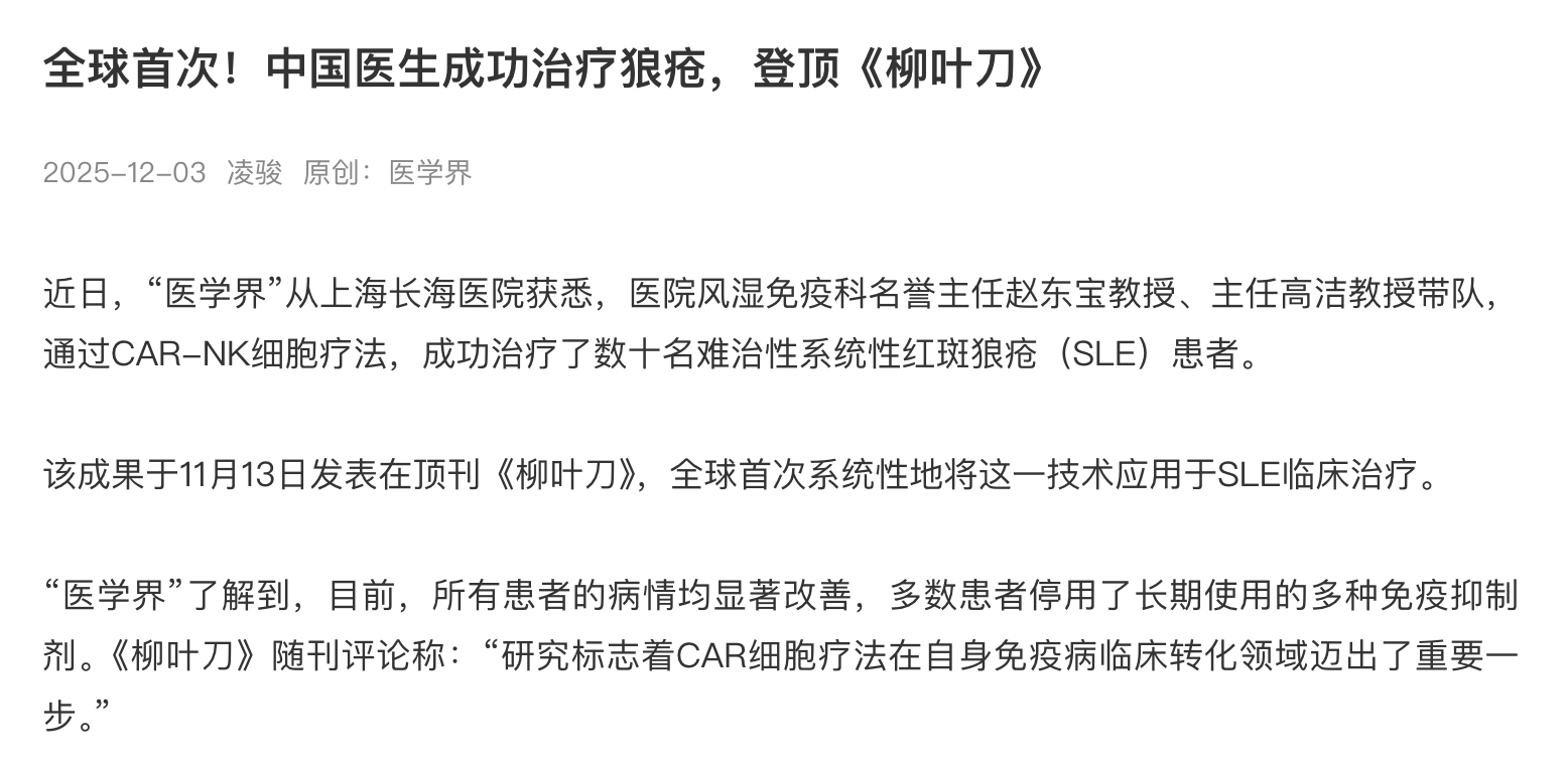 全球首例,中国医生成功用细胞疗法 CAR-NK 治愈系统性红斑狼疮,登上柳叶刀。