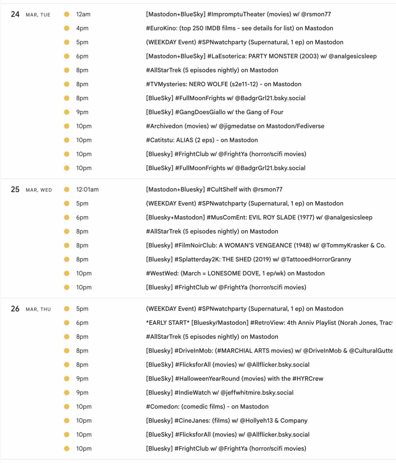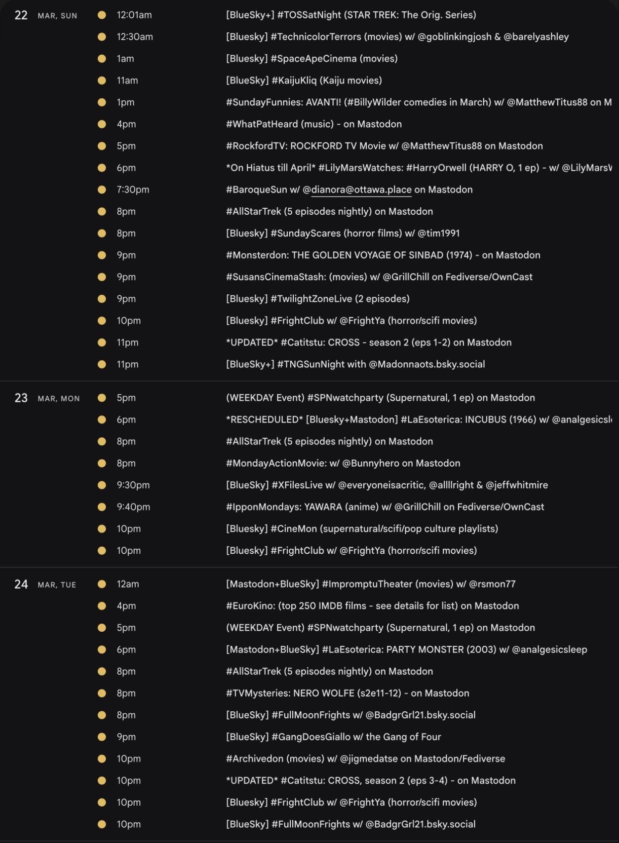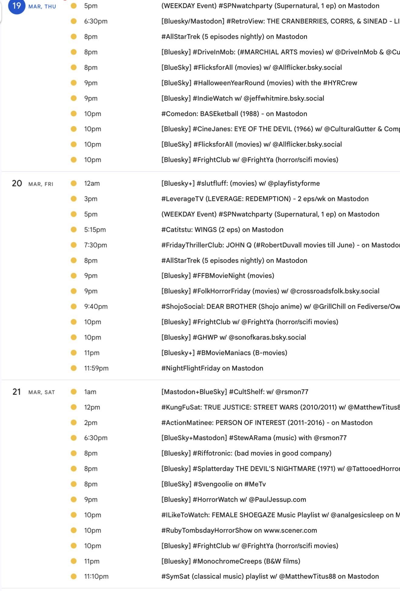 📆 It's the weekly #Mastodon/ #Fediverse #WatchPartyCalendar screencap for 2/26/26 - 3/5 (Thu-Thu)