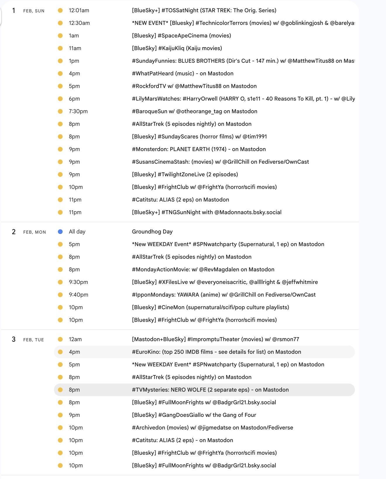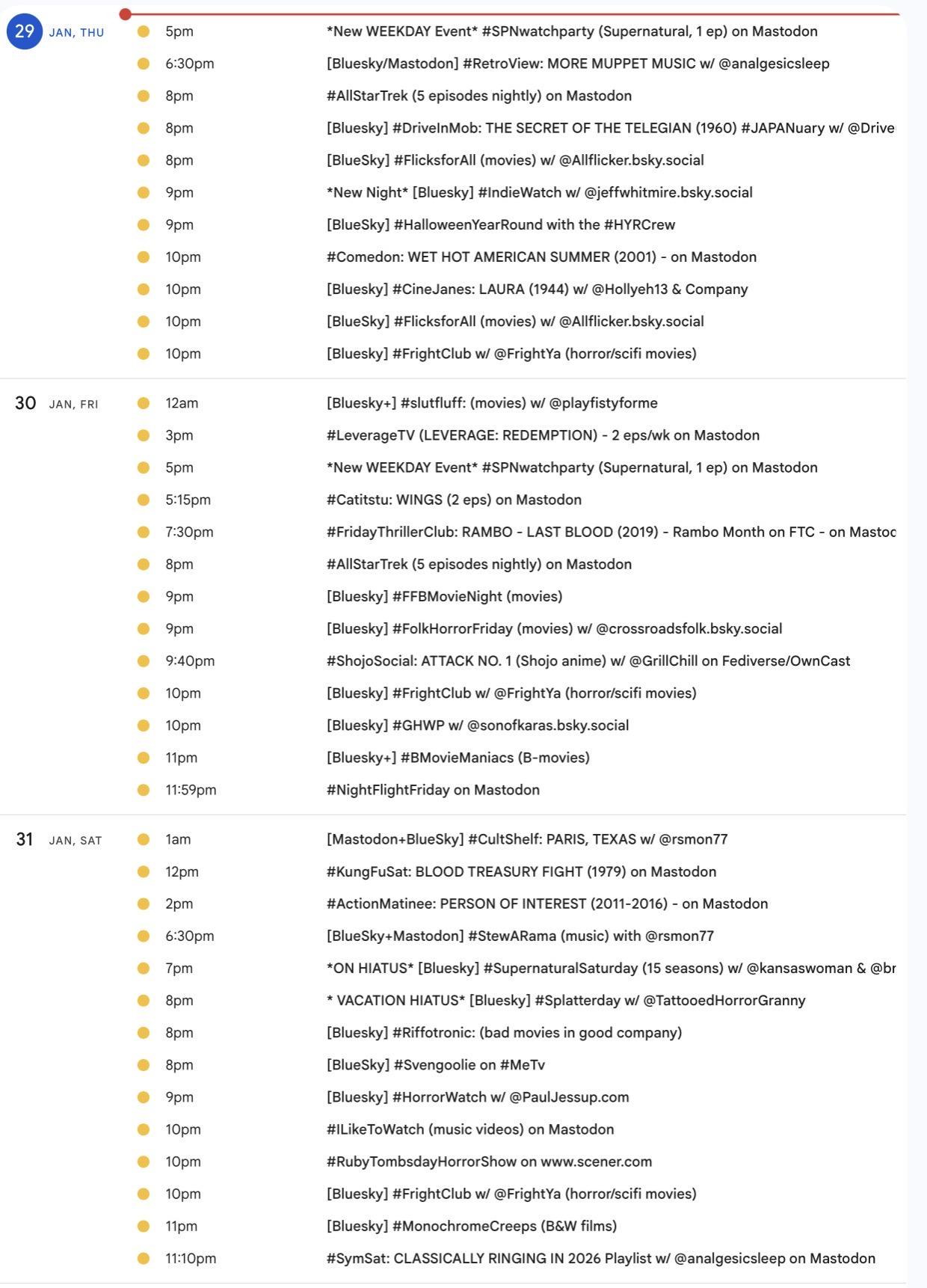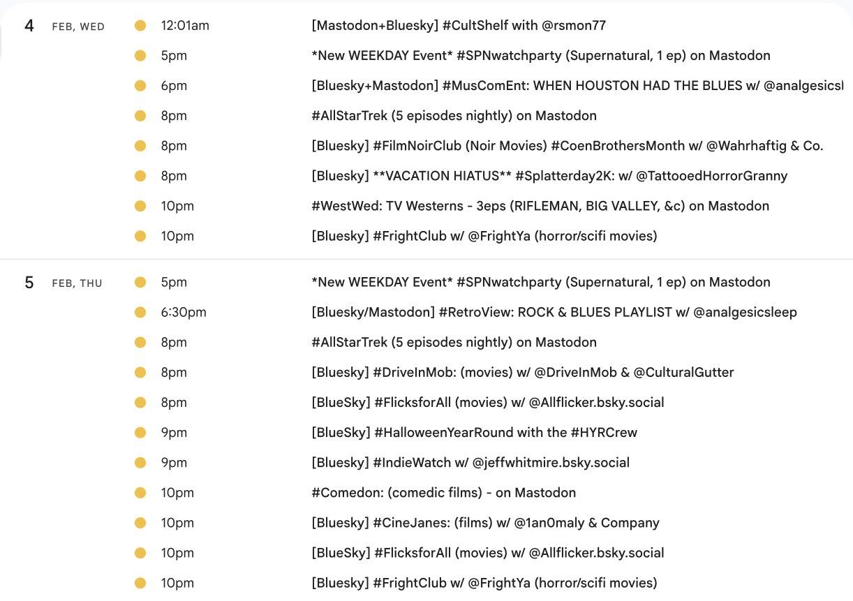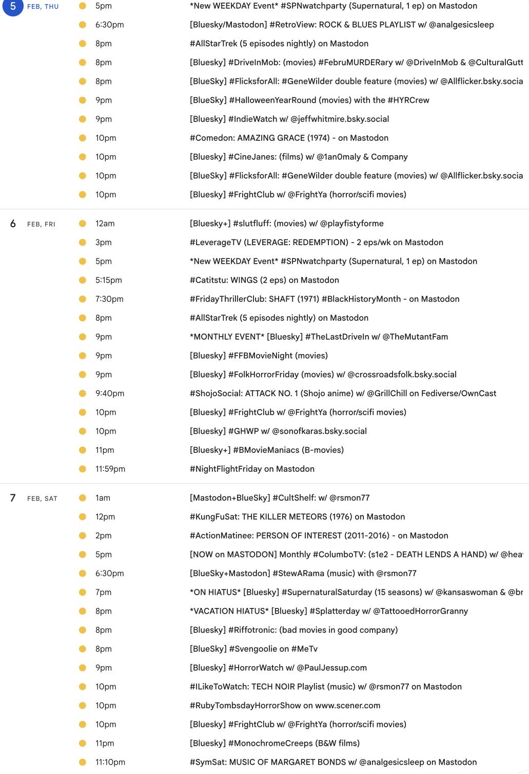 Happy February! 📺 It's the weekly #Mastodon/ #Fediverse #WatchPartyCalendar for 1/29-2/5 (Thu-Thu)