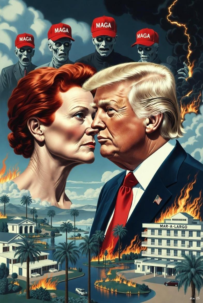 A union made in hell - if you like #Trumpigula and the Unstable Slavers empire so much, Puline, why not move over there and enjoy the ocean covering Mar-a-Lago courtesy of your favourite environment pillaging corporations together with him? #USFascism #auspol #AIart