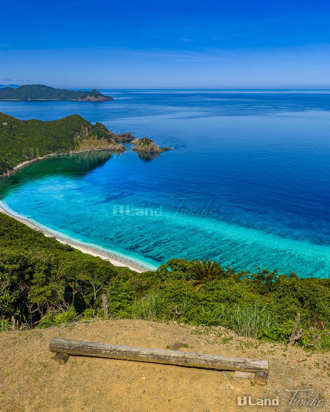 ベンチとリーフの絶景、加計呂麻島花富峠