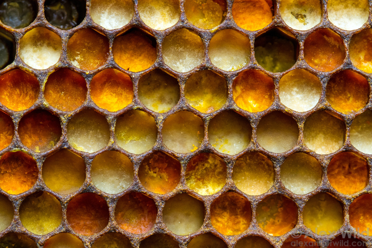The different colors of the cells indicate pollen from different species of plants, packed away to be used as food for hungry honey bee larvae.