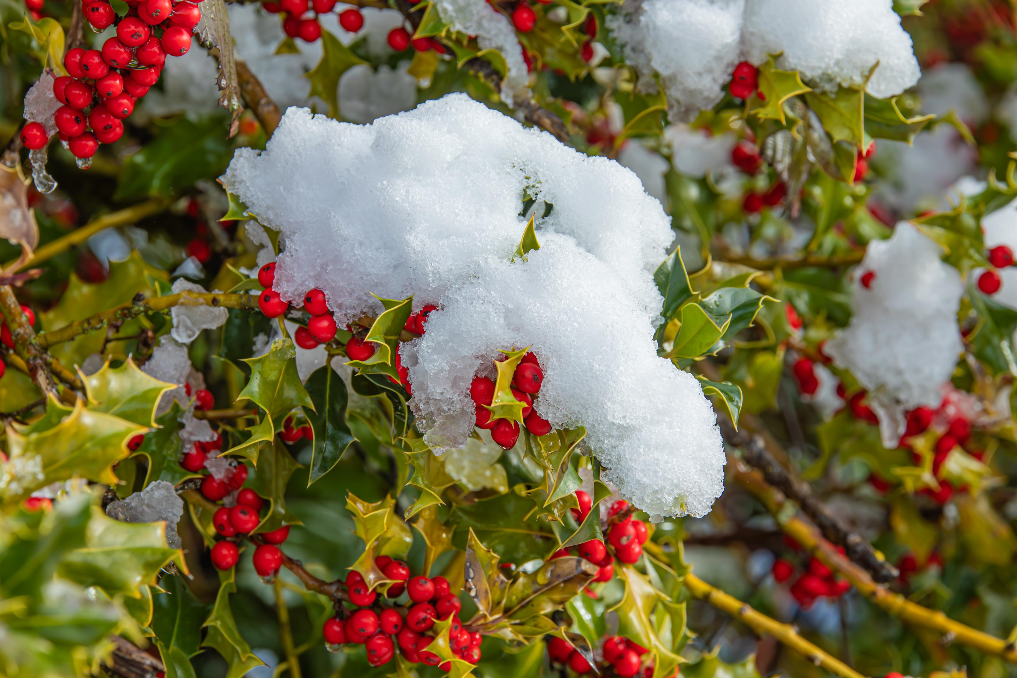 Wintry, Festive Holly Berries covered in freshly fallen snow.