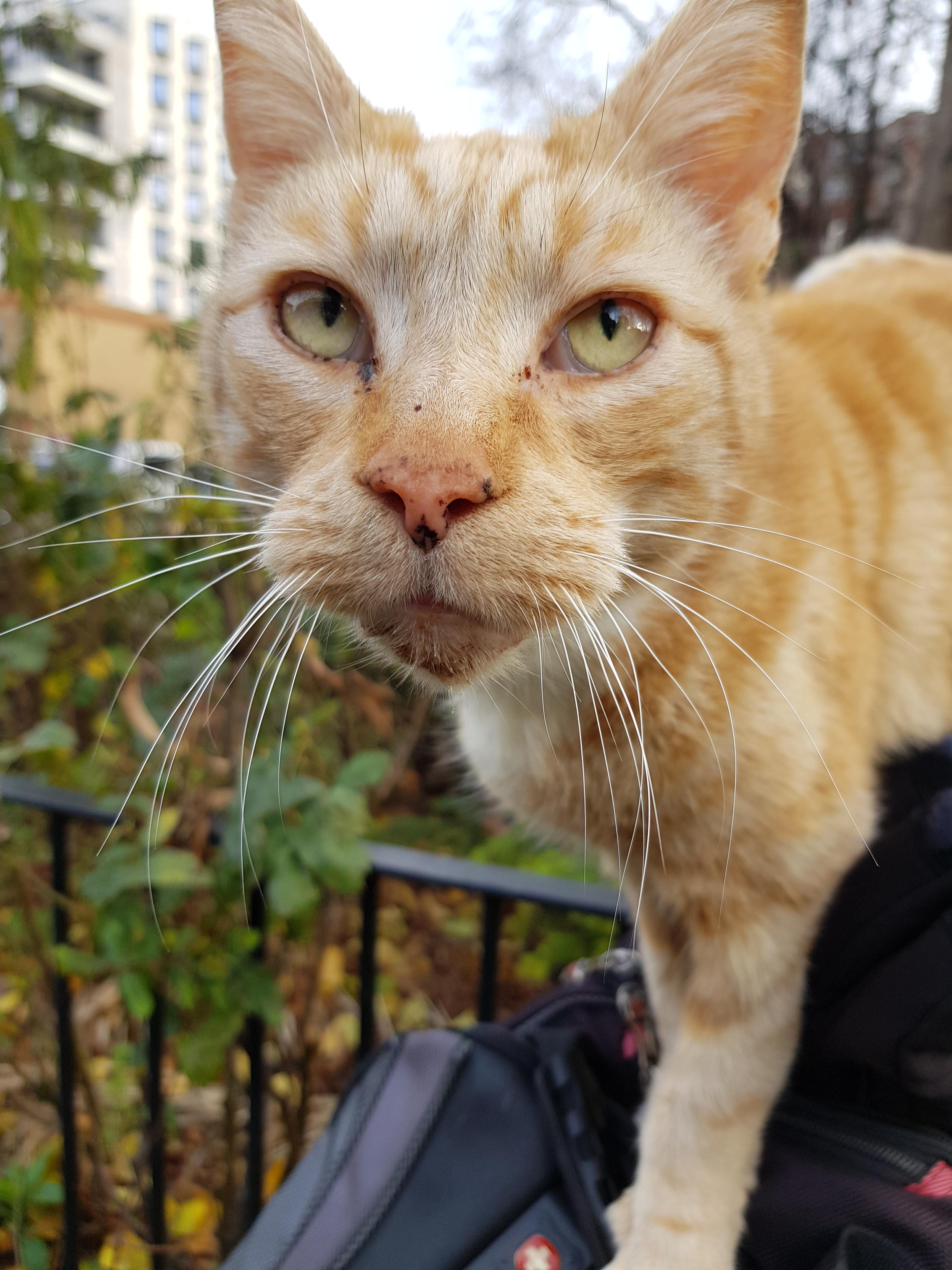 I sometimes see him on my cycle home from work. He's old and has an arthritic tail, but was still able to jump up onto my bike, and clamber onto the handlebars in order to headbutt me