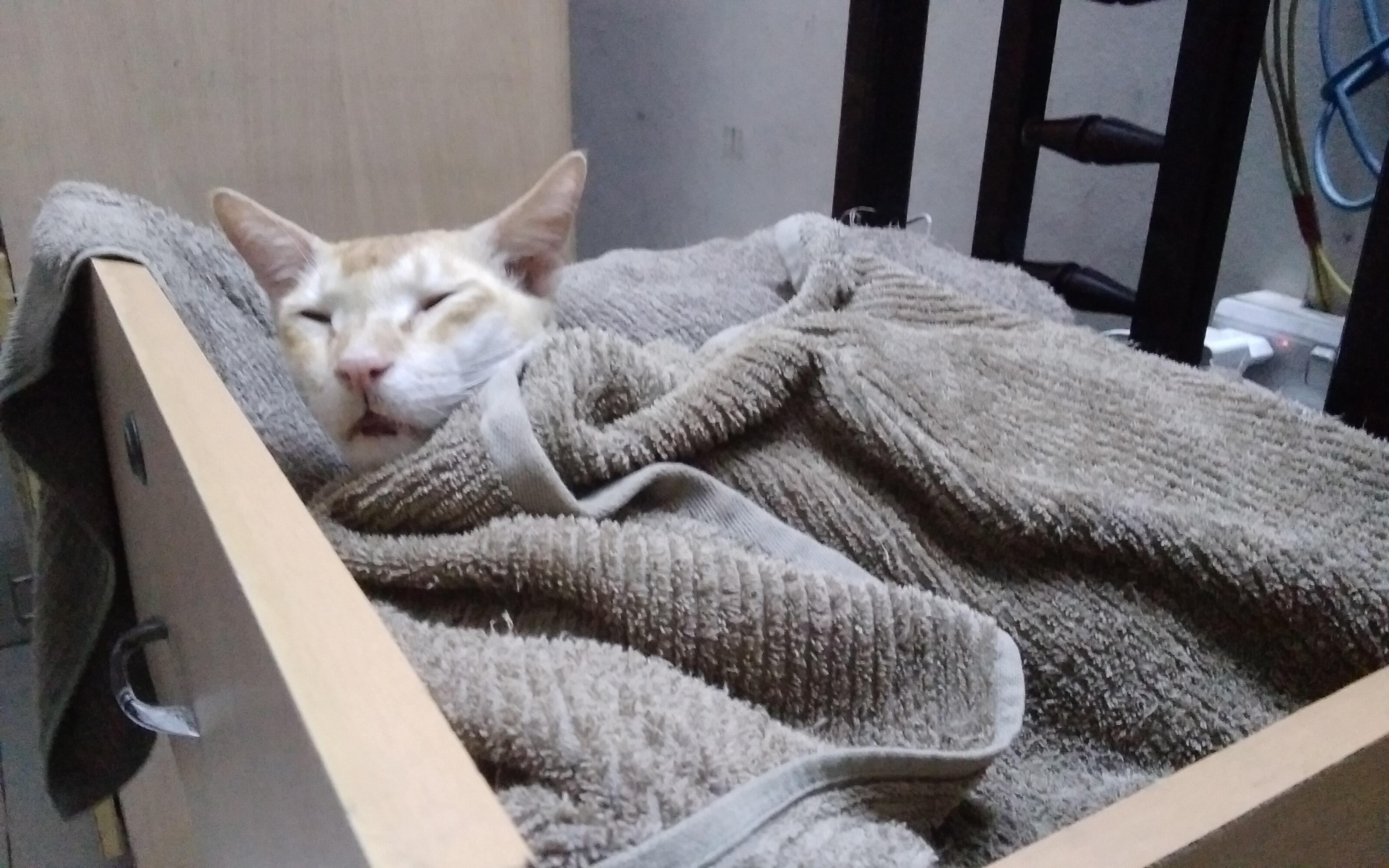 Had to make a makeshift clothing drawer due to insects eating up the closet. This lil fella found a new bed.