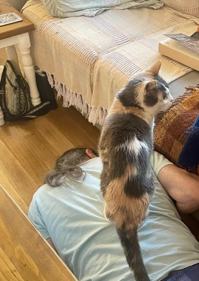 Alice, our Calico cat was extremely interested in something under the sofa. So I got down to look under it, and the cheeky bastard sat on me 😂 😂