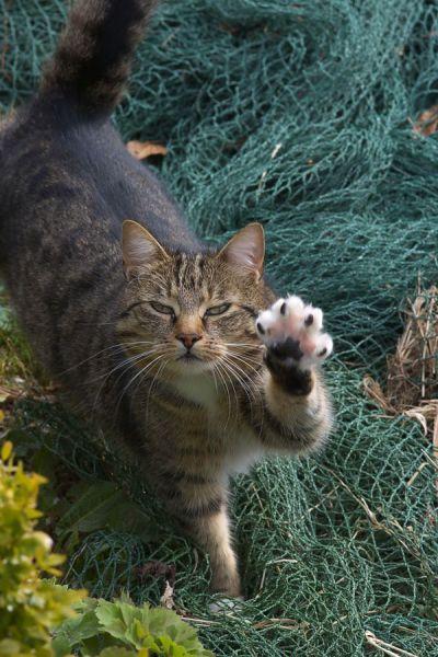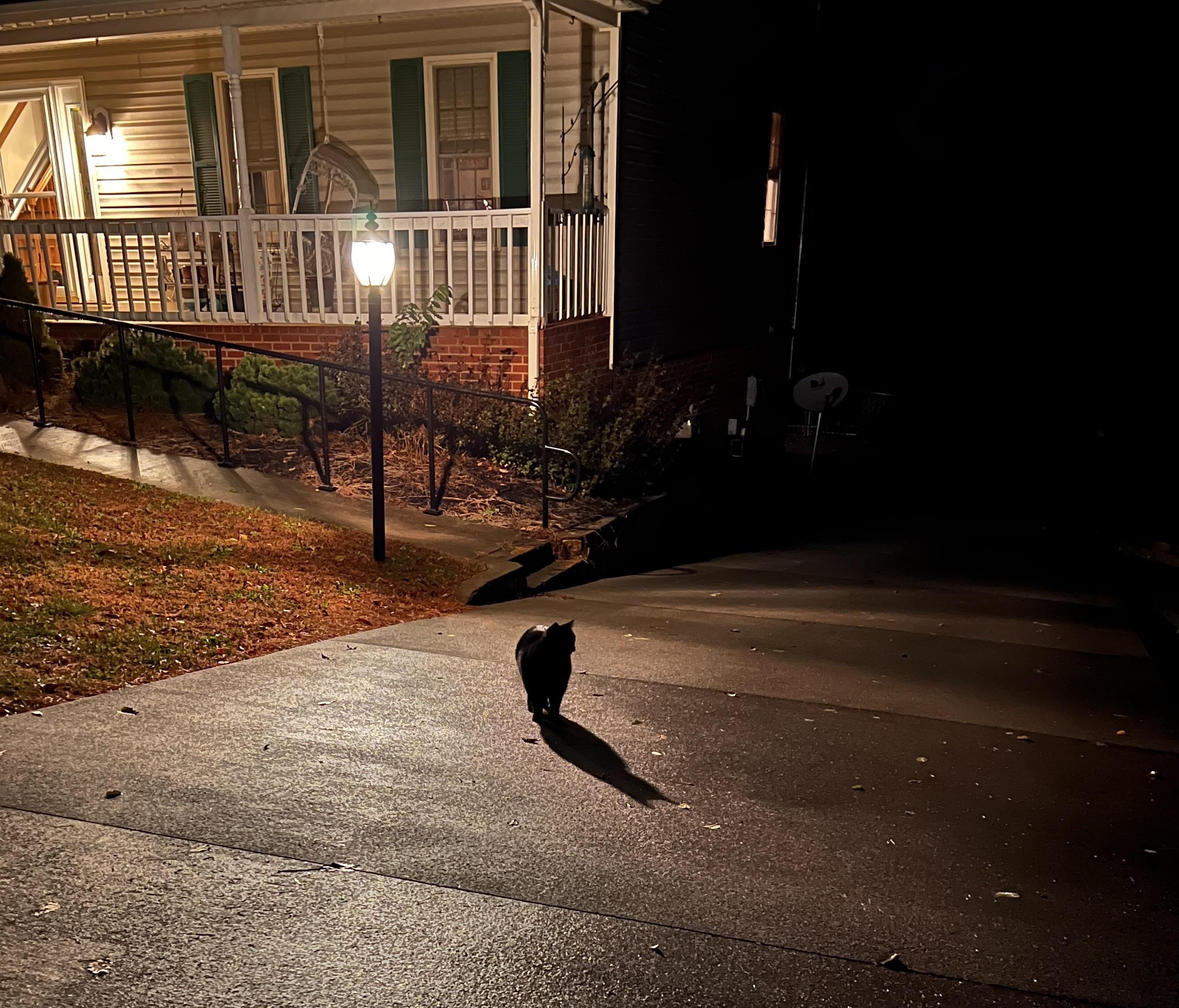 3. Fat Boy following me to put the trash out, wanting to take a walk (our cat who has many dog-like traits). If you look closely, you can see his sister through the glass of the front door.