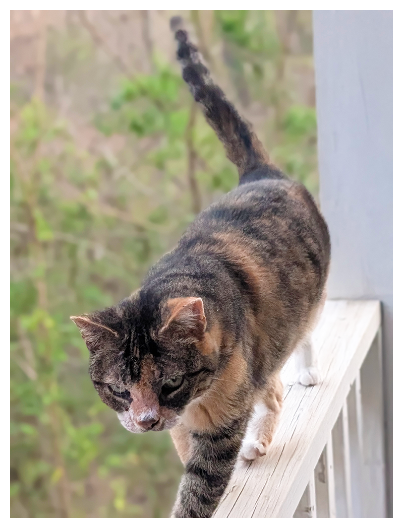 #CharleneTheCat, walking the porch rail, 7:01 PM. ❤️