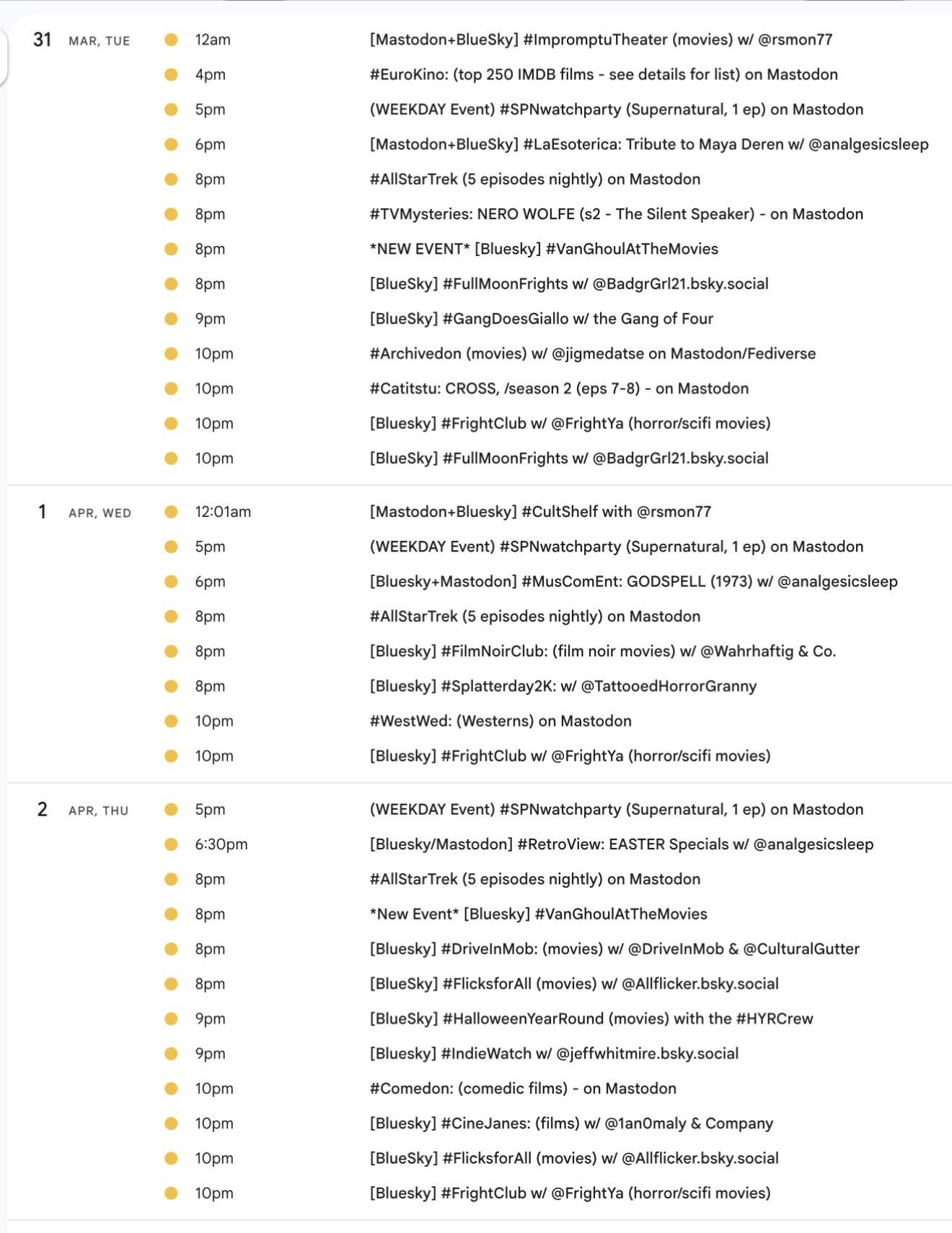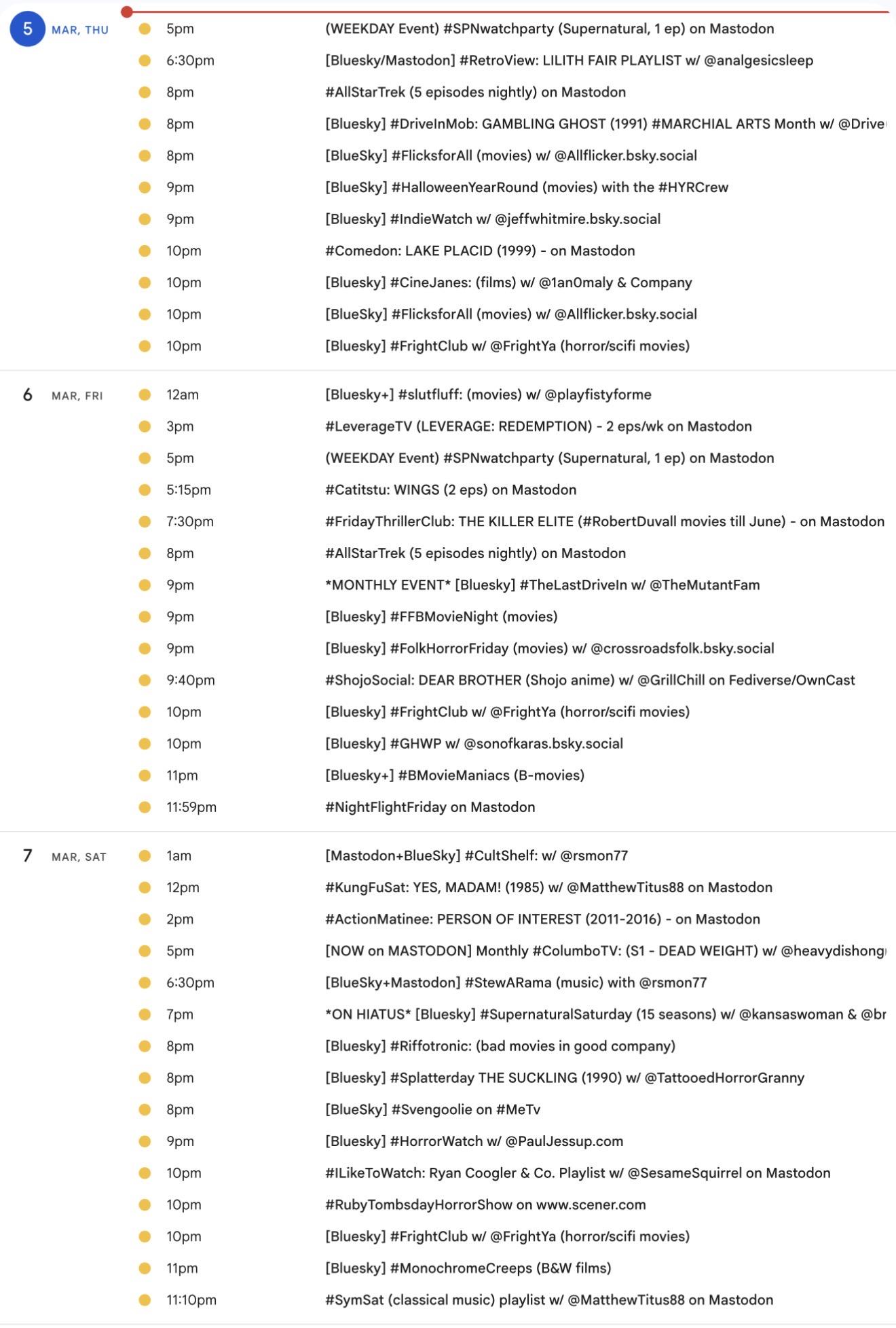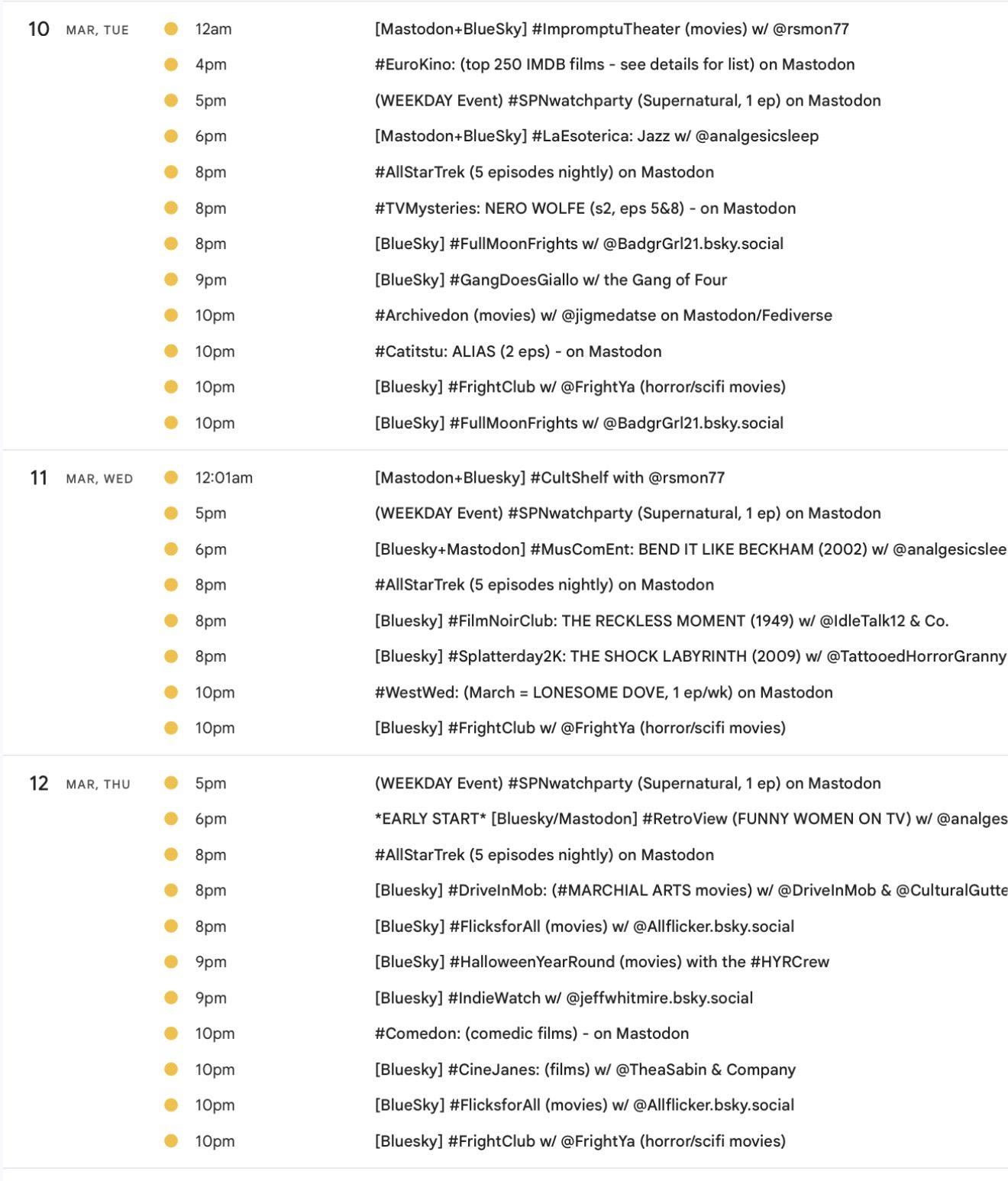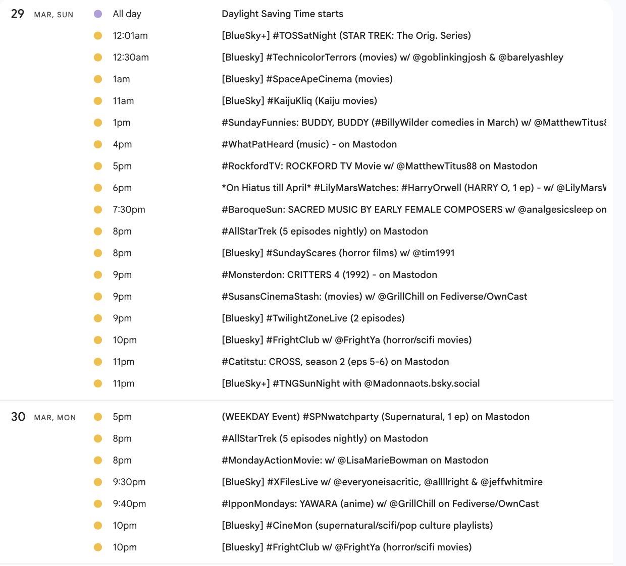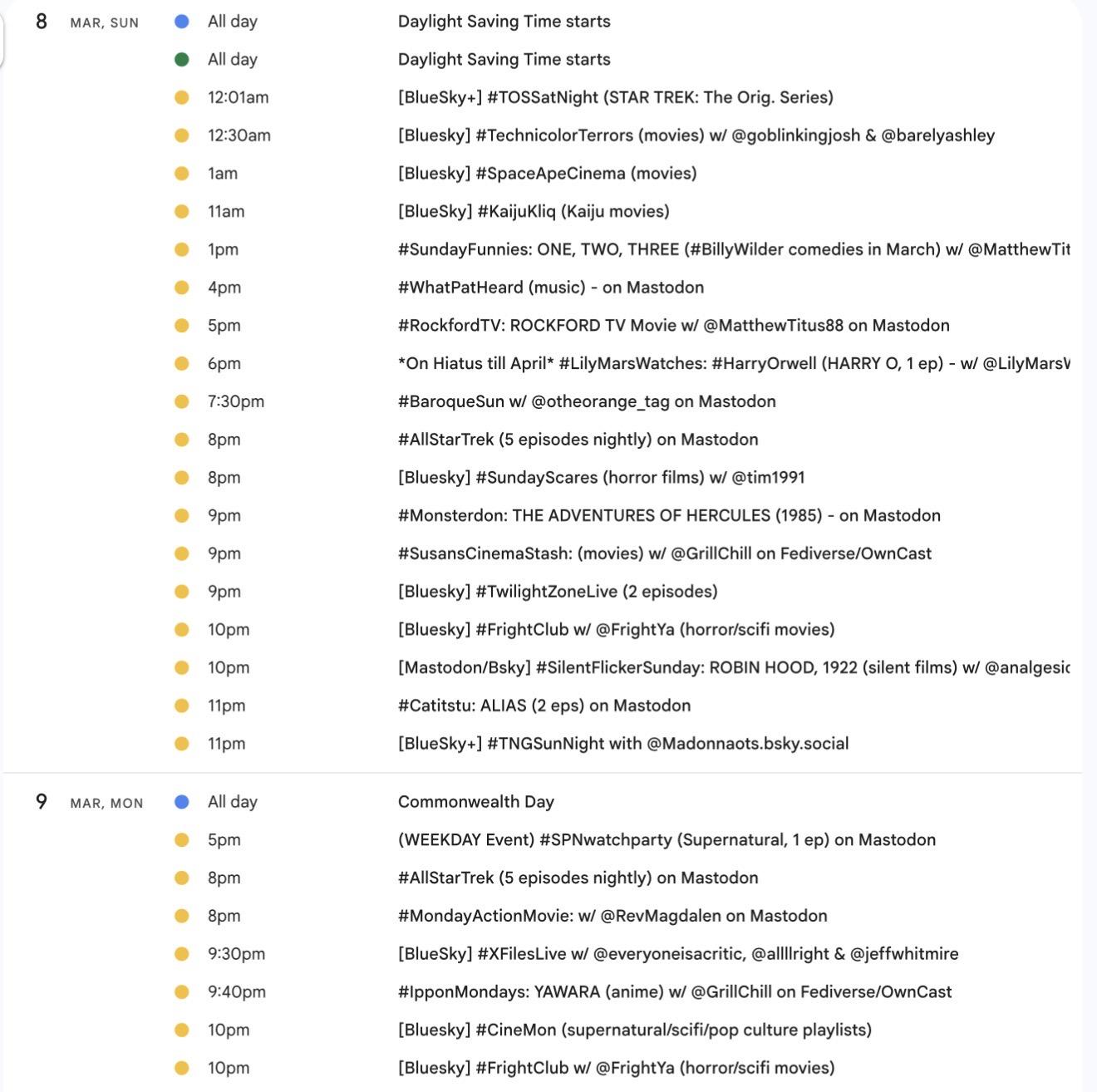 <p>It's time to change the clocks this weekend! 🇺🇸🇨🇦</p><p>📆 And it's the weekly <a href="/tags/mastodon/" rel="tag">#Mastodon</a>/ <a href="/tags/fediverse/" rel="tag">#Fediverse</a> <a href="/tags/watchpartycalendar/" rel="tag">#WatchPartyCalendar</a> screencap for Mar. 5-12 (Thu-Thu) </p><p>+ <a href="/tags/columbotv/" rel="tag">#ColumboTV</a> this Saturday! </p><p>📅Details &🔗s ➡️ <a href="http://bit.ly/MastodonWatchParties" rel="nofollow"><span class="invisible">http://</span>bit.ly/MastodonWatchParties</a><br>⏰️All times US Eastern</p><p><a href="/tags/westerns/" rel="tag">#Westerns</a> <a href="/tags/music/" rel="tag">#Music</a> <a href="/tags/mysteries/" rel="tag">#Mysteries</a> <a href="/tags/action/" rel="tag">#Action</a> <a href="/tags/comedy/" rel="tag">#Comedy</a> <a href="/tags/anime/" rel="tag">#anime</a> <a href="/tags/movies/" rel="tag">#Movies</a> <a href="/tags/filmmastodon/" rel="tag">#FilmMastodon</a> <a href="/tags/cinemastodon/" rel="tag">#CineMastodon</a> <a href="/tags/watchpartyalert/" rel="tag">#WatchPartyAlert</a></p><p>Thanks hosts! <span class="h-card"><a href="https://mastodon.social/@MatthewTitus88" class="u-url mention" rel="nofollow noopener noreferrer" target="_blank">@<span>MatthewTitus88</span></a></span> <span class="h-card"><a href="https://universeodon.com/@MirrorAyako" class="u-url mention" rel="nofollow noopener noreferrer" target="_blank">@<span>MirrorAyako</span></a></span> <span class="h-card"><a href="https://timeloop.cafe/@Taweret" class="u-url mention" rel="nofollow noopener noreferrer" target="_blank">@<span>Taweret</span></a></span> <span class="h-card"><a href="https://mastodon.social/@analgesicsleep" class="u-url mention" rel="nofollow noopener noreferrer" target="_blank">@<span>analgesicsleep</span></a></span> <span class="h-card"><a href="https://mastodon.social/@rsmon77" class="u-url mention" rel="nofollow noopener noreferrer" target="_blank">@<span>rsmon77</span></a></span> <span class="h-card"><a href="https://lazybear.social/@hyde" class="u-url mention" rel="nofollow noopener noreferrer" target="_blank">@<span>hyde</span></a></span> <span class="h-card"><a href="https://live.literalgrill.com/federation/user/GrillChill" class="u-url mention" rel="nofollow noopener noreferrer" target="_blank">@<span>GrillChill</span></a></span> <span class="h-card"><a href="https://mastodon.social/@greenpepper22" class="u-url mention" rel="nofollow noopener noreferrer" target="_blank">@<span>greenpepper22</span></a></span> <span class="h-card"><a href="https://dmv.community/@kamikat" class="u-url mention" rel="nofollow noopener noreferrer" target="_blank">@<span>kamikat</span></a></span> <span class="h-card"><a href="https://dobbs.town/@revmagdalen" class="u-url mention" rel="nofollow noopener noreferrer" target="_blank">@<span>revmagdalen</span></a></span><br><span class="h-card"><a href="https://mastodon.social/@heavydishongry" class="u-url mention" rel="nofollow noopener noreferrer" target="_blank">@<span>heavydishongry</span></a></span></p>