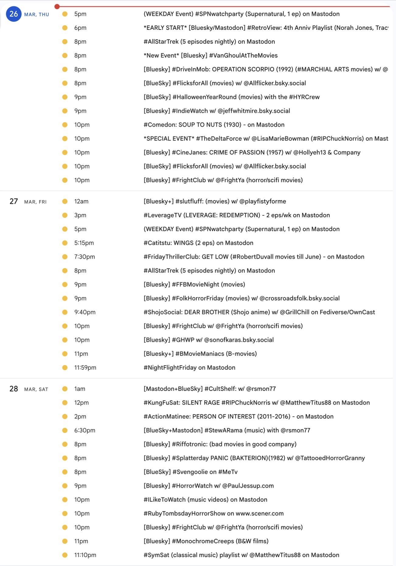 <p>📺📅 It's the weekly <a href="/tags/mastodon/" rel="tag">#Mastodon</a>/ <a href="/tags/fediverse/" rel="tag">#Fediverse</a> <a href="/tags/watchpartycalendar/" rel="tag">#WatchPartyCalendar</a> screencap </p><p>3/26 - 4/2 (Thu-Thu)</p><p>Special Event <a href="/tags/thedeltaforce/" rel="tag">#TheDeltaForce</a> 3/26 <a href="/tags/ripchucknorris/" rel="tag">#RIPChuckNorris</a></p><p>📅Details &🔗s ➡️ <a href="http://bit.ly/MastodonWatchParties" rel="nofollow"><span class="invisible">http://</span>bit.ly/MastodonWatchParties</a><br>⏰️All times US Eastern</p><p><a href="/tags/westerns/" rel="tag">#Westerns</a> <a href="/tags/music/" rel="tag">#Music</a> <a href="/tags/mysteries/" rel="tag">#Mysteries</a> <a href="/tags/action/" rel="tag">#Action</a> <a href="/tags/comedy/" rel="tag">#Comedy</a> <a href="/tags/anime/" rel="tag">#anime</a> <a href="/tags/movies/" rel="tag">#Movies</a> <a href="/tags/filmmastodon/" rel="tag">#FilmMastodon</a> <a href="/tags/cinemastodon/" rel="tag">#CineMastodon</a> <a href="/tags/watchpartyalert/" rel="tag">#WatchPartyAlert</a></p><p>Thanks hosts! <span class="h-card"><a href="https://mastodon.social/@MatthewTitus88" class="u-url mention" rel="nofollow noopener noreferrer" target="_blank">@<span>MatthewTitus88</span></a></span> <span class="h-card"><a href="https://universeodon.com/@MirrorAyako" class="u-url mention" rel="nofollow noopener noreferrer" target="_blank">@<span>MirrorAyako</span></a></span> <span class="h-card"><a href="https://timeloop.cafe/@Taweret" class="u-url mention" rel="nofollow noopener noreferrer" target="_blank">@<span>Taweret</span></a></span> <span class="h-card"><a href="https://mastodon.social/@analgesicsleep" class="u-url mention" rel="nofollow noopener noreferrer" target="_blank">@<span>analgesicsleep</span></a></span> <span class="h-card"><a href="https://mastodon.social/@rsmon77" class="u-url mention" rel="nofollow noopener noreferrer" target="_blank">@<span>rsmon77</span></a></span> <span class="h-card"><a href="https://lazybear.social/@hyde" class="u-url mention" rel="nofollow noopener noreferrer" target="_blank">@<span>hyde</span></a></span> <span class="h-card"><a href="https://mastodon.social/@greenpepper22" class="u-url mention" rel="nofollow noopener noreferrer" target="_blank">@<span>greenpepper22</span></a></span> <span class="h-card"><a href="https://dmv.community/@kamikat" class="u-url mention" rel="nofollow noopener noreferrer" target="_blank">@<span>kamikat</span></a></span> <span class="h-card"><a href="https://mastodon.social/@LisaMarieBowman" class="u-url mention" rel="nofollow noopener noreferrer" target="_blank">@<span>LisaMarieBowman</span></a></span></p>