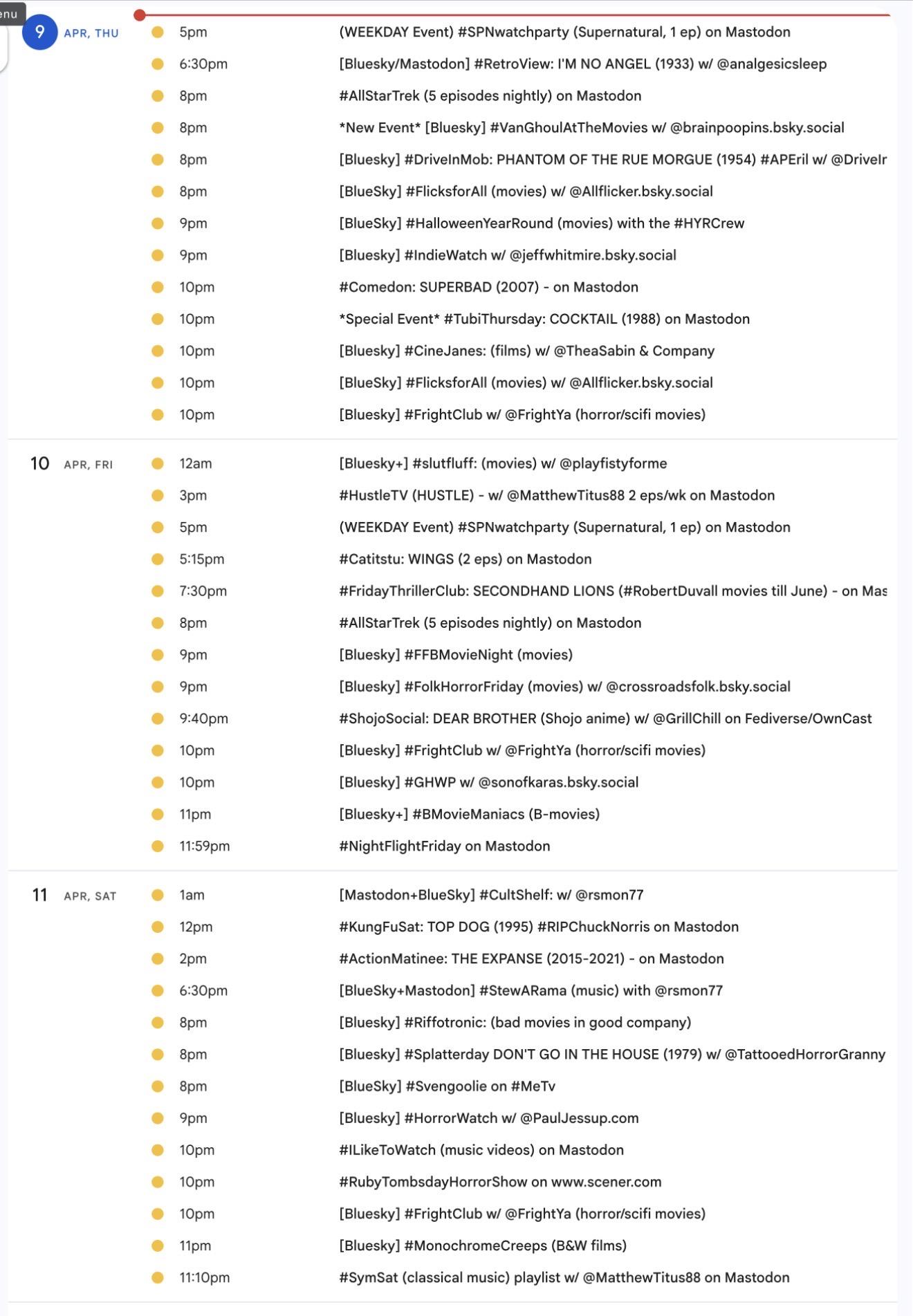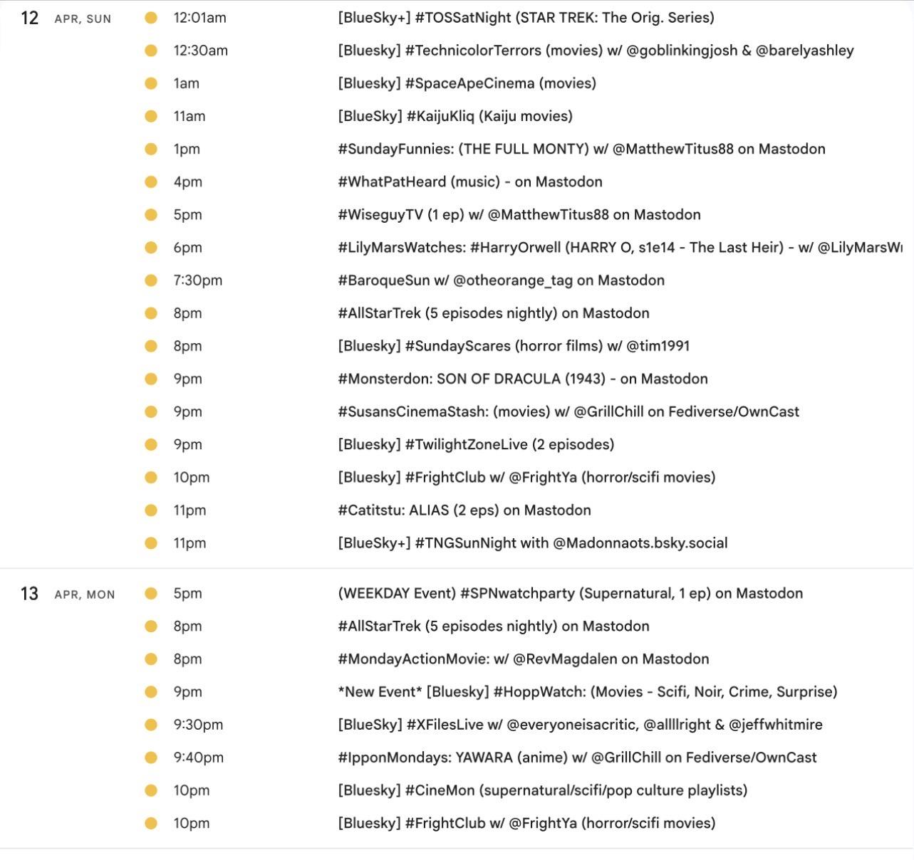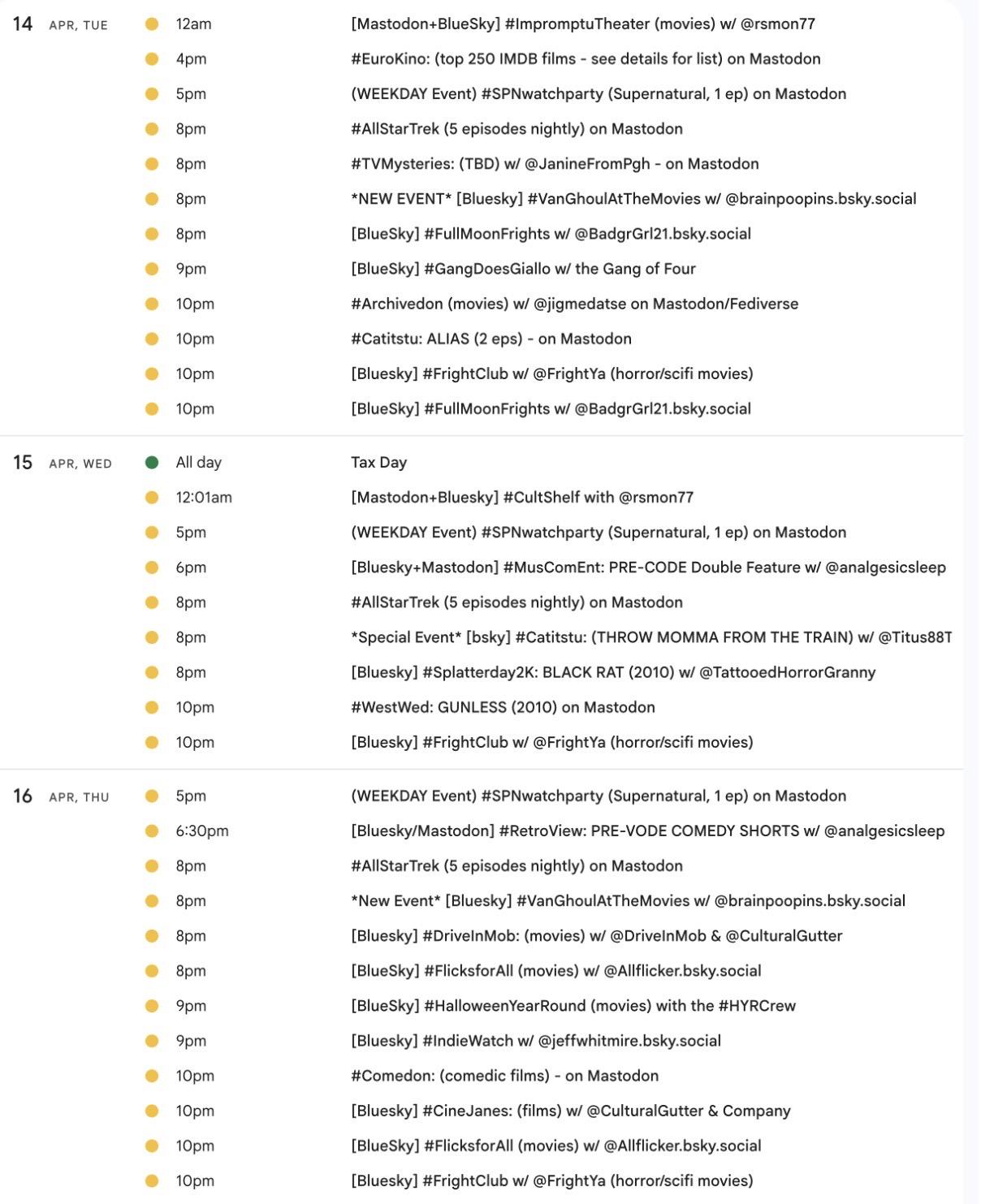 <p>It's the weekly <a href="/tags/mastodon/" rel="tag">#Mastodon</a>/ <a href="/tags/fediverse/" rel="tag">#Fediverse</a> <a href="/tags/watchpartycalendar/" rel="tag">#WatchPartyCalendar</a> screencap 📺</p><p>April 9-16 (Thu-Thu) 💰💸w/ US TAX DAY ➡️🚨auto-postmarks now AS OF ARRIVAL AT PROCESSING CENTER (2-3 days later) 📫 </p><p>📅Details &🔗s ➡️ <a href="http://bit.ly/MastodonWatchParties" rel="nofollow"><span class="invisible">http://</span>bit.ly/MastodonWatchParties</a><br>⏰️All times US Eastern</p><p><a href="/tags/westerns/" rel="tag">#Westerns</a> <a href="/tags/music/" rel="tag">#Music</a> <a href="/tags/mysteries/" rel="tag">#Mysteries</a> <a href="/tags/action/" rel="tag">#Action</a> <a href="/tags/comedy/" rel="tag">#Comedy</a> <a href="/tags/anime/" rel="tag">#anime</a> <a href="/tags/movies/" rel="tag">#Movies</a> <a href="/tags/filmmastodon/" rel="tag">#FilmMastodon</a> <a href="/tags/cinemastodon/" rel="tag">#CineMastodon</a> <a href="/tags/watchpartyalert/" rel="tag">#WatchPartyAlert</a></p><p>Thx hosts <span class="h-card"><a href="https://mastodon.social/@MatthewTitus88" class="u-url mention" rel="nofollow noopener noreferrer" target="_blank">@<span>MatthewTitus88</span></a></span> <span class="h-card"><a href="https://universeodon.com/@MirrorAyako" class="u-url mention" rel="nofollow noopener noreferrer" target="_blank">@<span>MirrorAyako</span></a></span> <span class="h-card"><a href="https://timeloop.cafe/@Taweret" class="u-url mention" rel="nofollow noopener noreferrer" target="_blank">@<span>Taweret</span></a></span> <span class="h-card"><a href="https://mastodon.social/@analgesicsleep" class="u-url mention" rel="nofollow noopener noreferrer" target="_blank">@<span>analgesicsleep</span></a></span> <span class="h-card"><a href="https://mastodon.social/@rsmon77" class="u-url mention" rel="nofollow noopener noreferrer" target="_blank">@<span>rsmon77</span></a></span> <span class="h-card"><a href="https://lazybear.social/@hyde" class="u-url mention" rel="nofollow noopener noreferrer" target="_blank">@<span>hyde</span></a></span> <span class="h-card"><a href="https://mastodon.social/@greenpepper22" class="u-url mention" rel="nofollow noopener noreferrer" target="_blank">@<span>greenpepper22</span></a></span> <span class="h-card"><a href="https://dmv.community/@kamikat" class="u-url mention" rel="nofollow noopener noreferrer" target="_blank">@<span>kamikat</span></a></span> <span class="h-card"><a href="https://mastodon.social/@lilymarswrites" class="u-url mention" rel="nofollow noopener noreferrer" target="_blank">@<span>lilymarswrites</span></a></span> <span class="h-card"><a href="https://dobbs.town/@revmagdalen" class="u-url mention" rel="nofollow noopener noreferrer" target="_blank">@<span>revmagdalen</span></a></span> <span class="h-card"><a href="https://mastodon.social/@JanineFromPgh" class="u-url mention" rel="nofollow noopener noreferrer" target="_blank">@<span>JanineFromPgh</span></a></span></p>