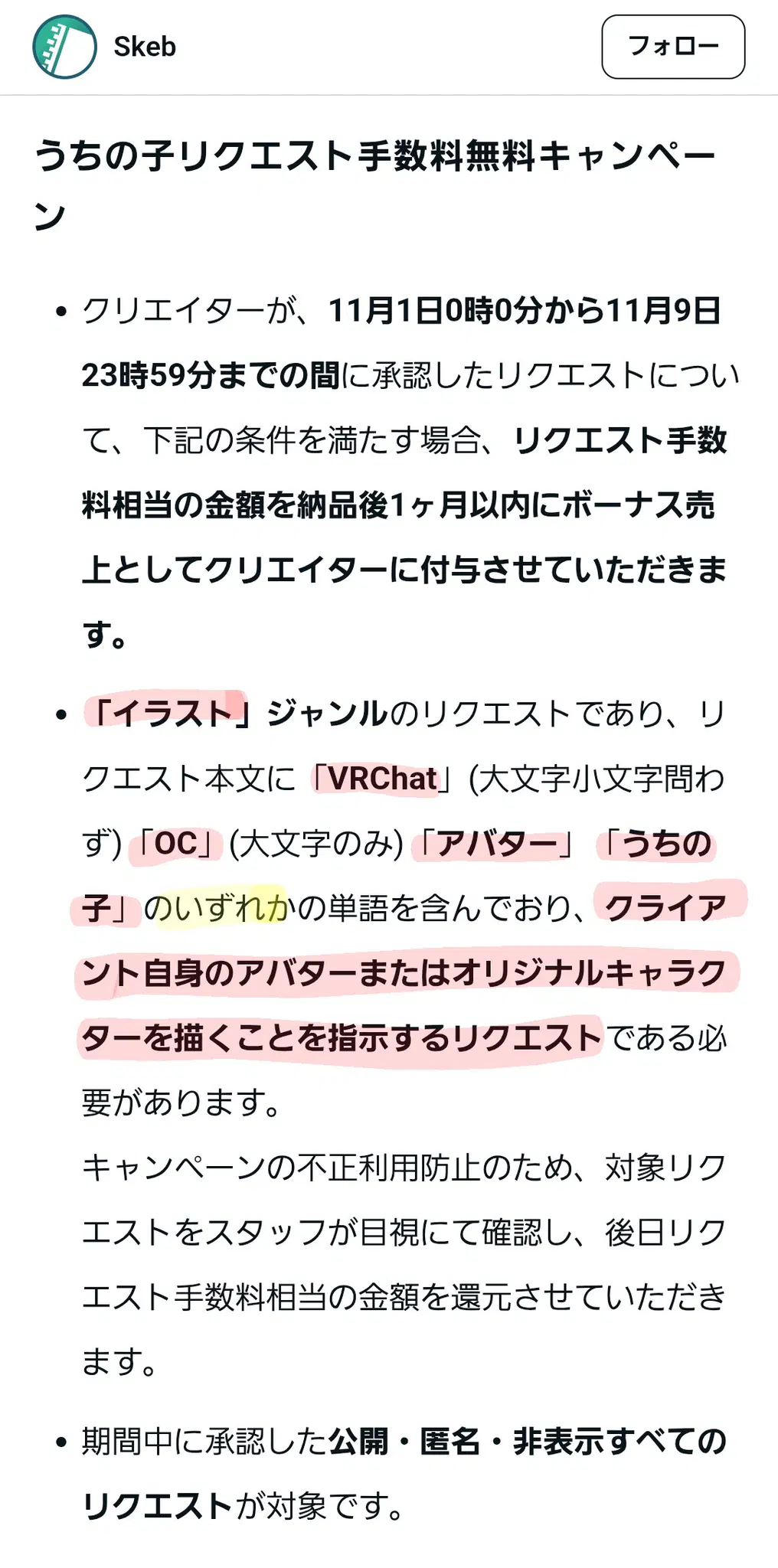 の条件はhttps://note.com/skeb/n/nfd46b10bc7c2より引用、4枚目に載せました