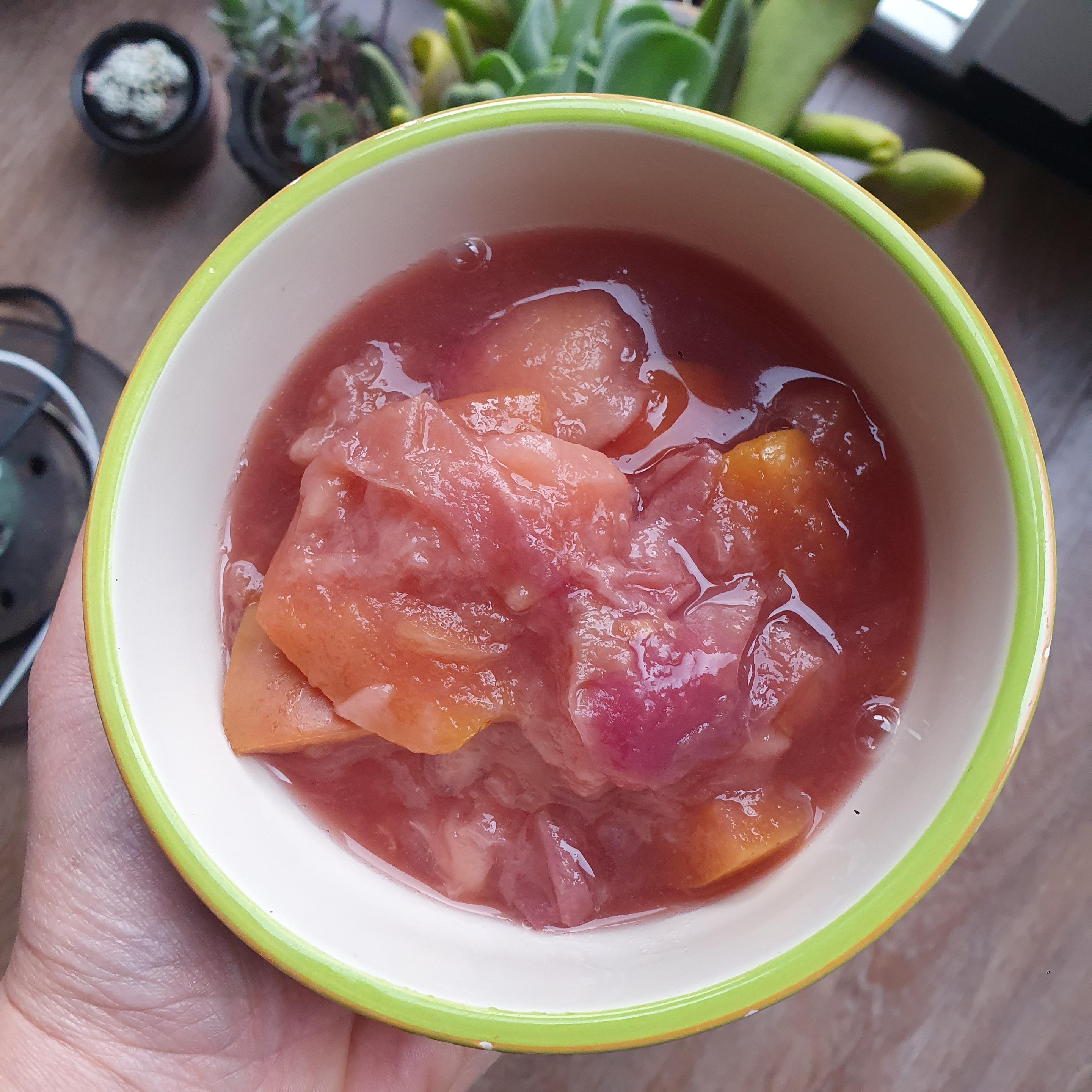 At a later point, get them out of the freezer, add them to a pot, heat & cook on low flame until turned into a lovely compote. No extra water or sugar necessary. I tend to always have apples as a basis, but otherwise is whatever I can find in the freezer.