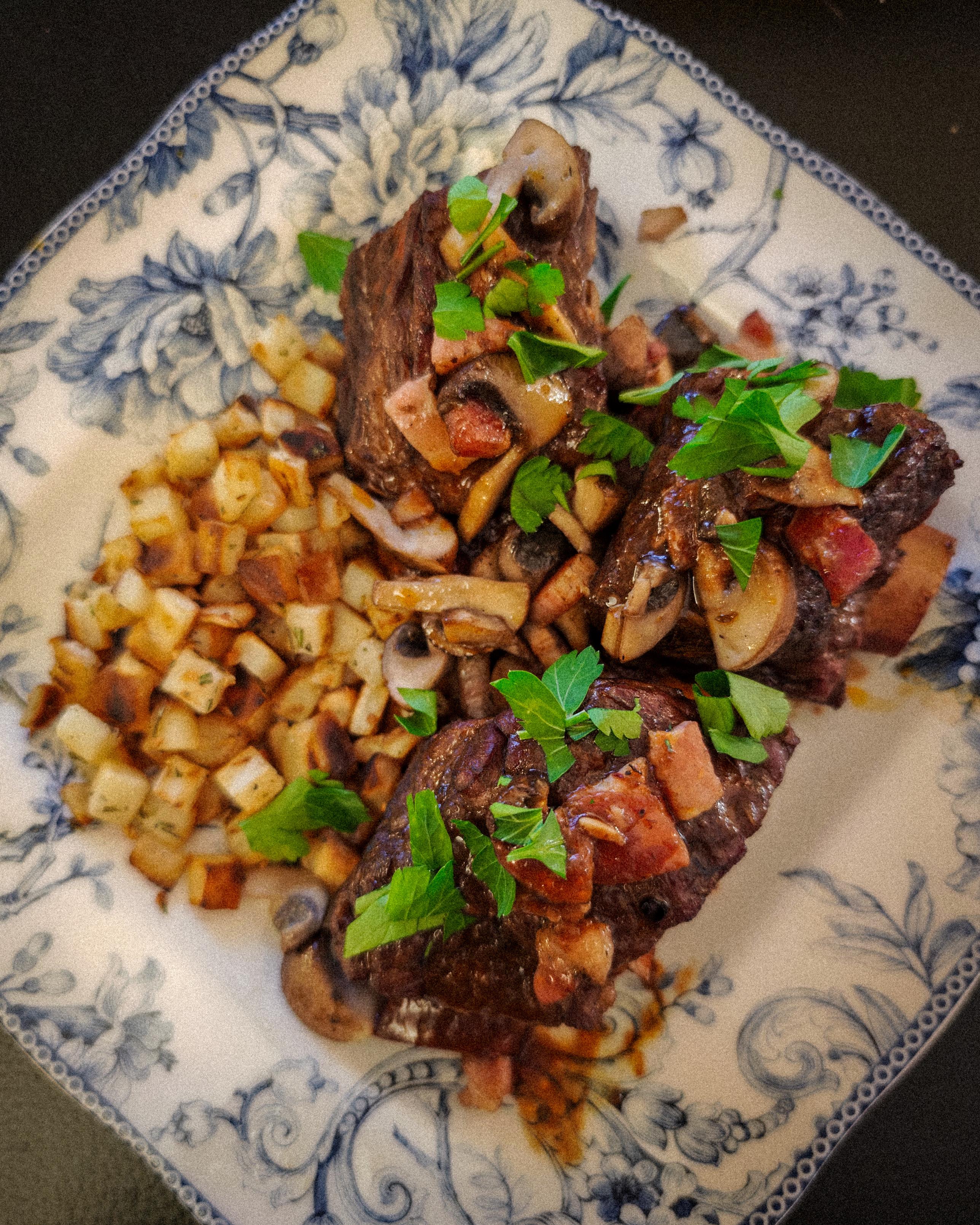 Slowed cooked beef short ribs braised in red wine, topped with pancetta and mushrooms