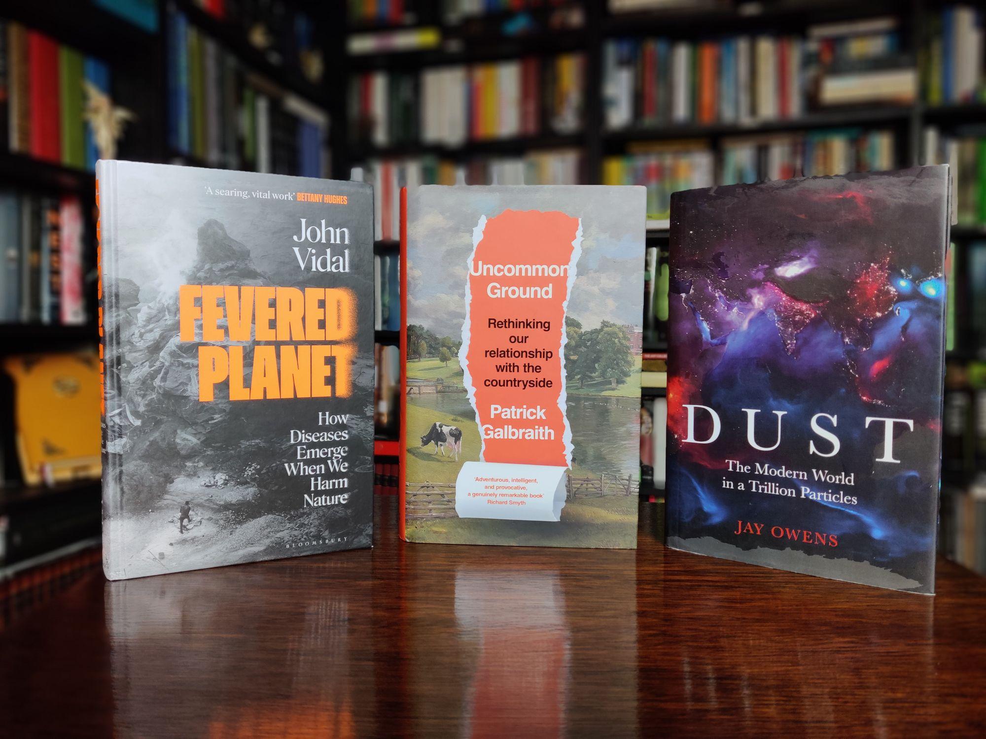 This week's #NewBooks at the library: I bought second-hand copies of Fevered Planet: How #Diseases Emerge When We Harm Nature by the late John Vidal and #Dust: The Modern World in a Trillion Particles by Jay Owens, and picked up a review copy of Uncommon Ground: Rethinking Our Relationship With the #Countryside by Patrick Galbraith.