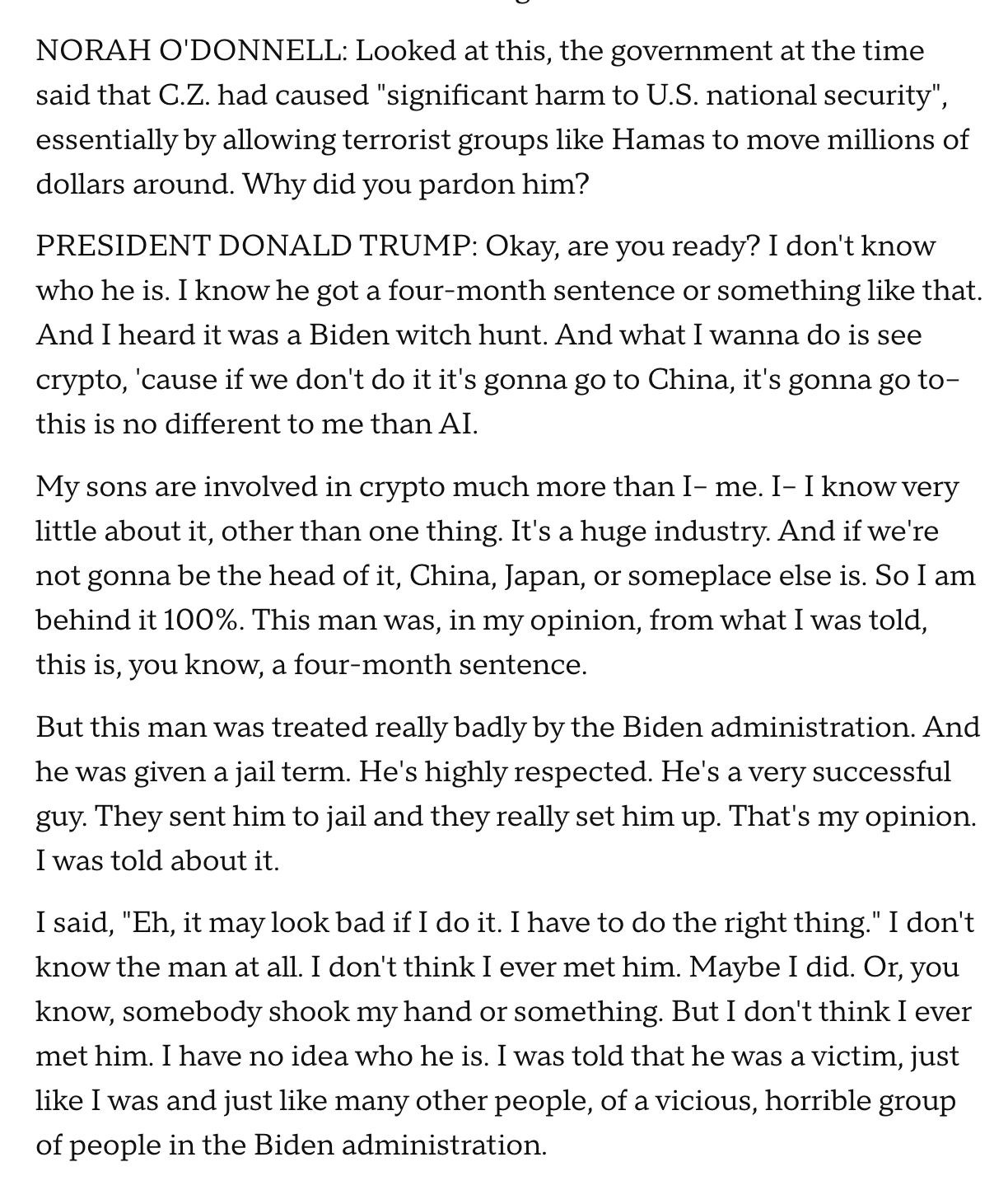 The full CBS interview with Trump about the pardon of Binance's Changpeng Zhao is shocking. https://www.cbsnews.com/news/read-full-transcript-norah-odonnell-60-minutes-interview-with-president-trump/