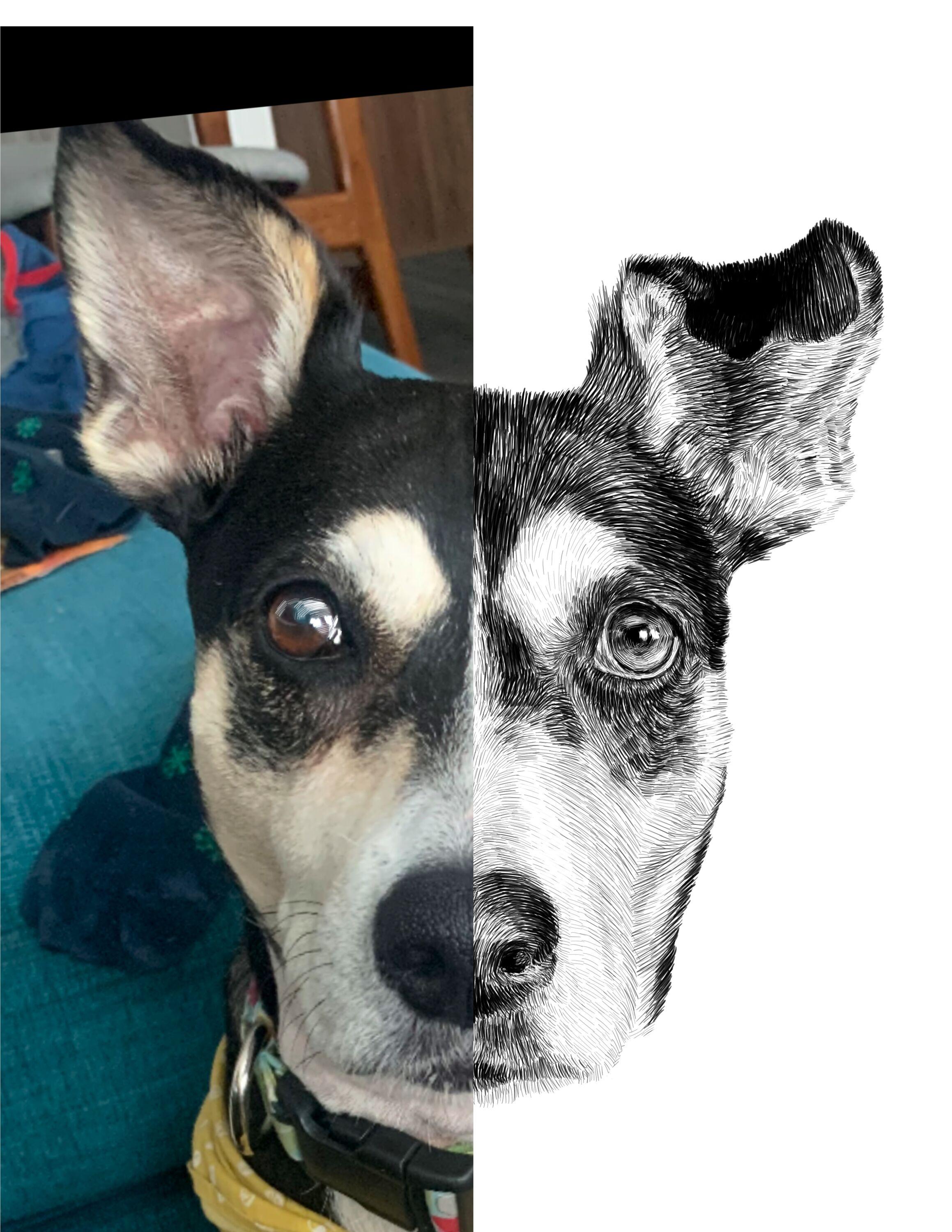 This is my custom drawing of Annie the cute dog! This portrait will eventually become a reflective foiled print, and this particular style helps foil release cleanly from the paper.