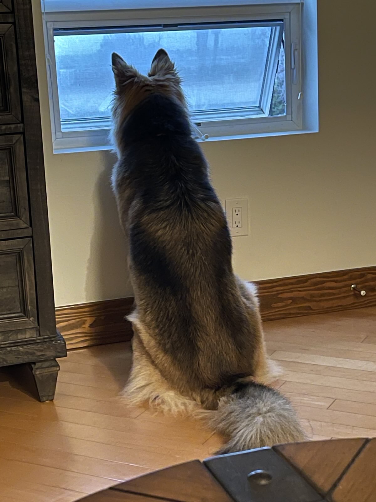 My dog loves to just sit and look out of the window for hours at people walking by on the sidewalk. I like to say it is his version of watching TV.#DogsOfMastodon #DogsOfFediverse #GermanShepherdDog
