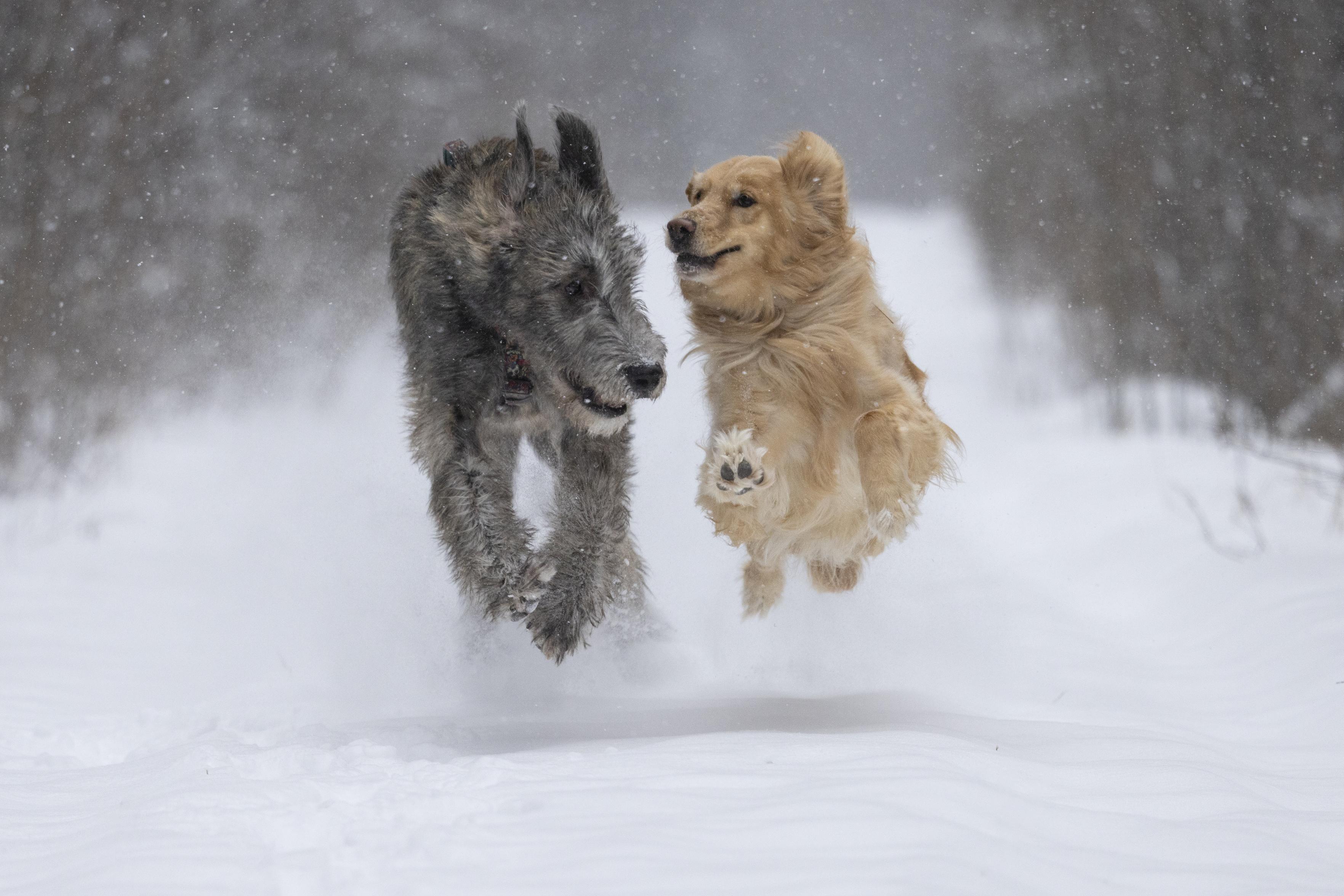 After a stretch of warm weather the snow has returned! The dogs were happy. #DogsOfMastodon #IrishWolfhound #GoldenRetriever #winter #snow