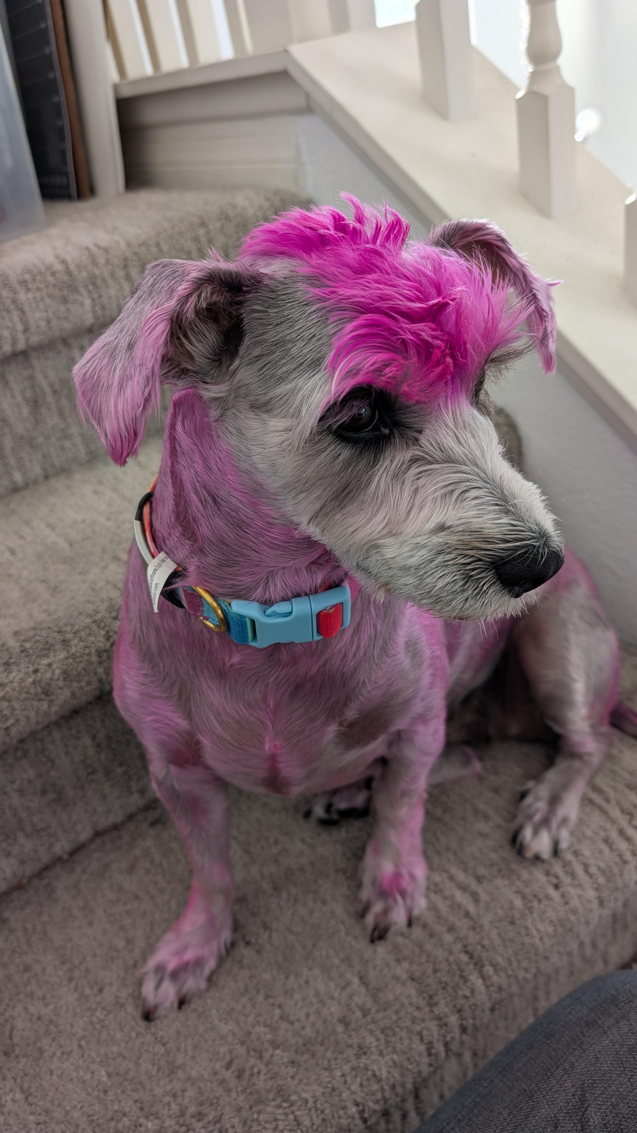 So, uhhh, we have a dog now? She's a rescue. A schnauzer poodle mix, her fur was pretty matted and flea-bitten, so one of the first things we did was get her groomed and washed. That trim produced a pronounced mohawk, so my wife thought it might be cute to dye her mohawk pink. Turns out dyeing a dog is not trivial, so now she's got a pink mohawk and slightly pink fur overall. She doesn't seem to mind, but people (especially kids) are delighted to see this pink dog.