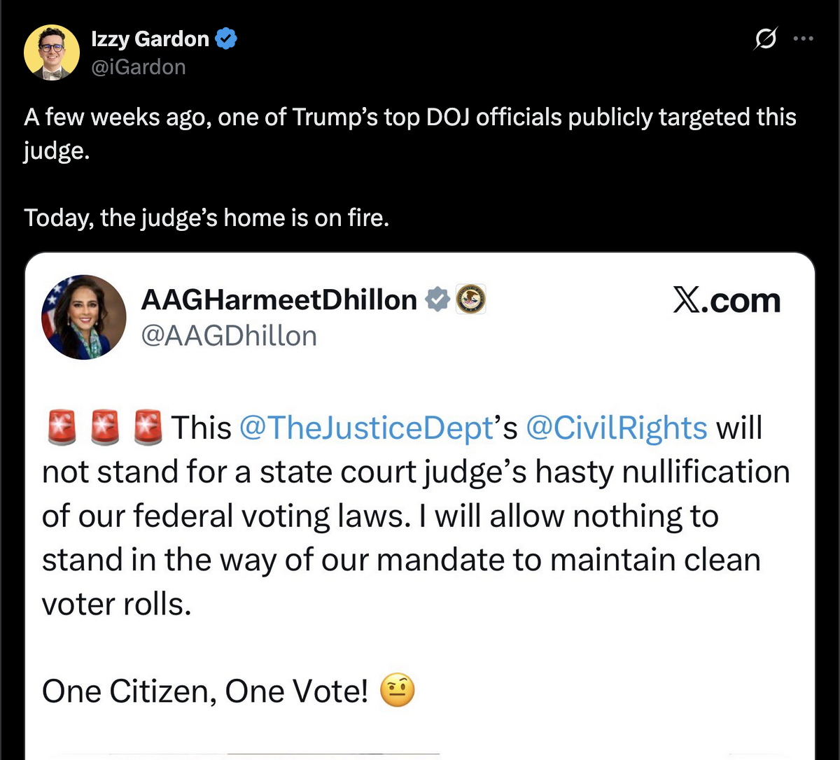 a few weeks ago the #MAGA harpie running the federal civil rights division at #DOJ (Harmeet Dhillon) called out a so-called "liberal judge" Diane Goodstein for ruling against the trump administration, after which that judge received all kinds of threats from MAGA chuds.