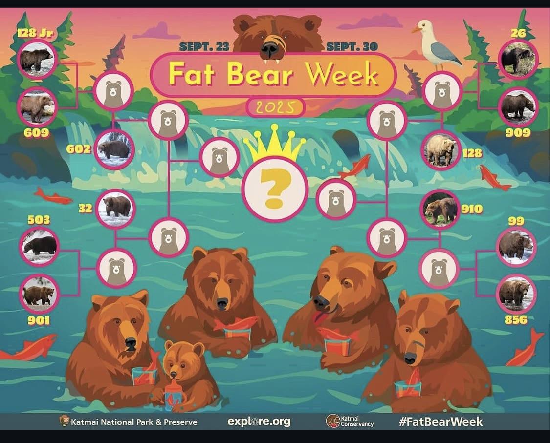 The Brackets are out! 📝 Vote at http://fatbearweek.org (or https://explore.org/fat-bear-week ) weekdays 9/23-9/30 between 12-9 Eastern Time ⏰