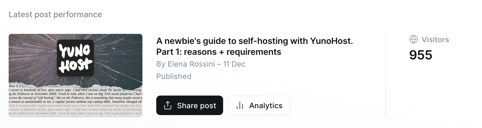 Ghost v.6 has new metrics built in... I was shocked to see the number of visitors to my first post about YunoHost: 955!