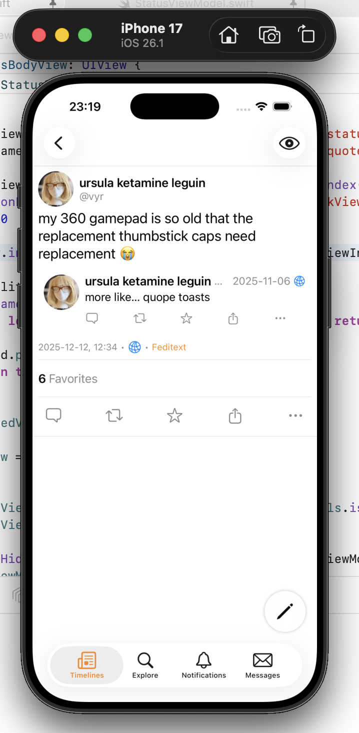 Feditext beta users: version 1.7.2 (build 140) fixes a JSON decoding issue with Mastodon 4.4 / 4.5 instances that caused error messages when quoted posts are viewed or on a timeline.