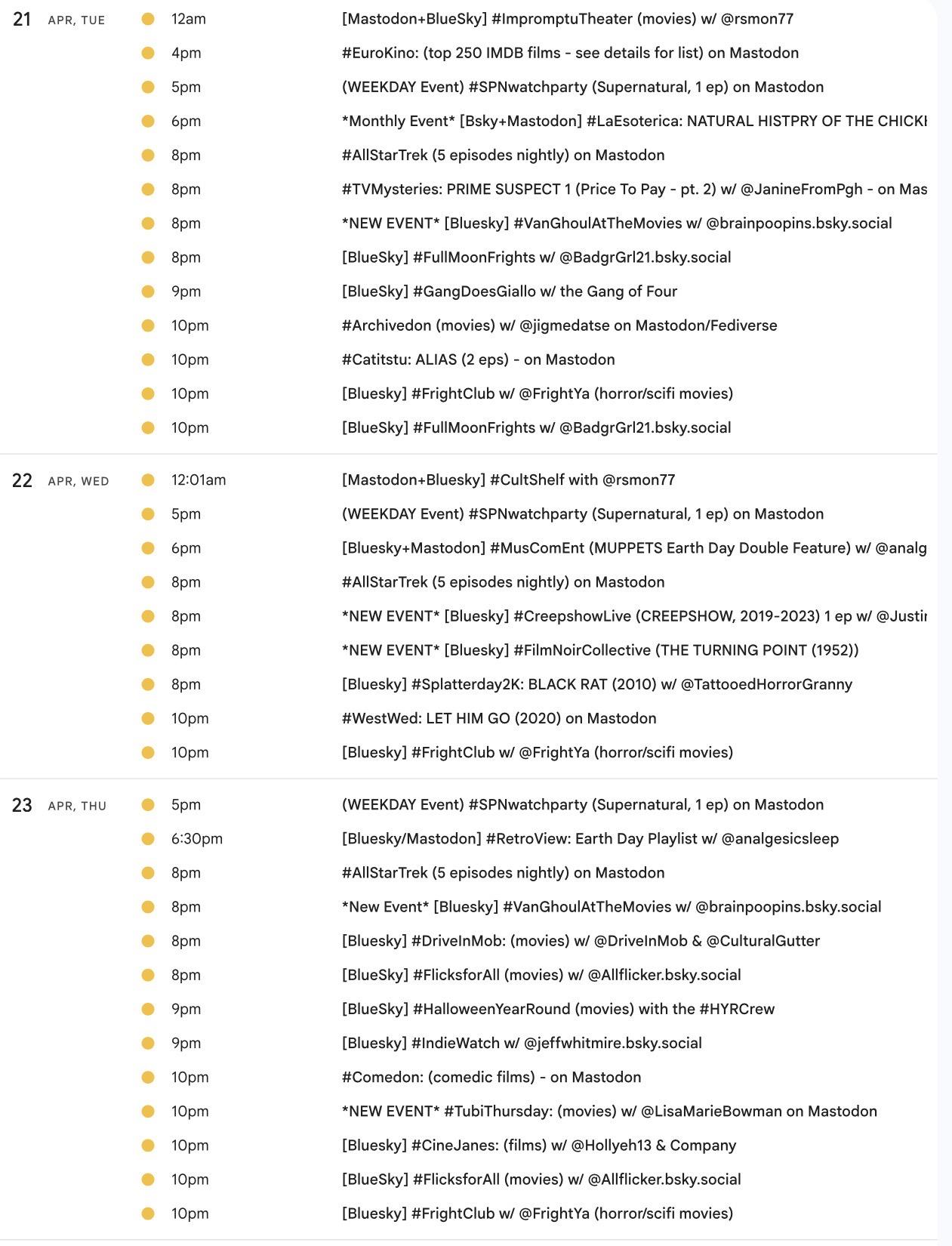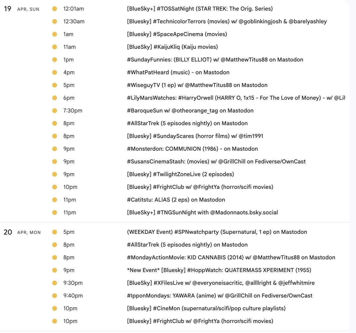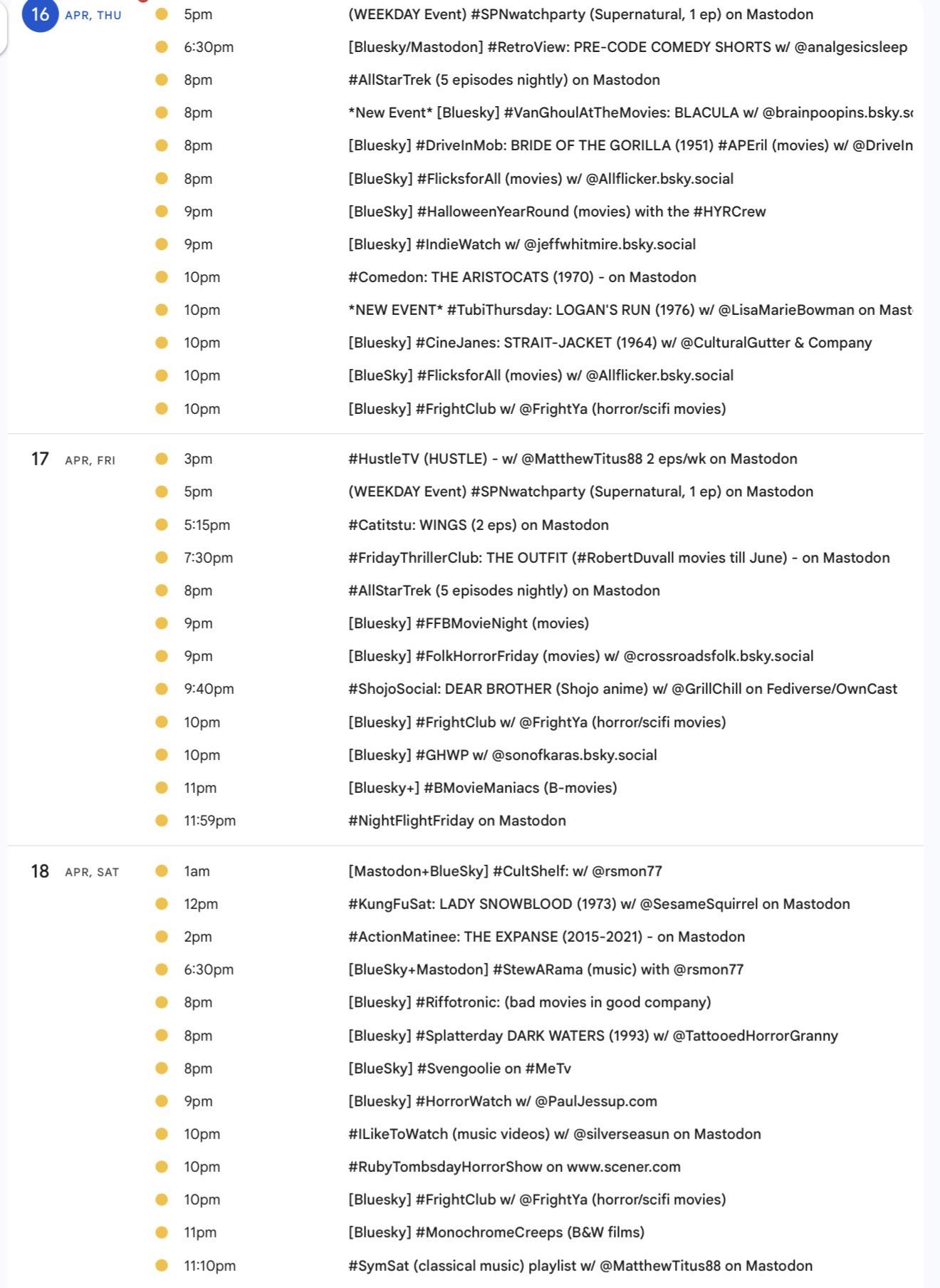 <p>It's the weekly <a href="/tags/mastodon/" rel="tag">#Mastodon</a>/ <a href="/tags/fediverse/" rel="tag">#Fediverse</a> <a href="/tags/watchpartycalendar/" rel="tag">#WatchPartyCalendar</a> screencap 📺 for April 16-23 (Thu-Thu) </p><p>⭐️NEW: <a href="/tags/tubithursday/" rel="tag">#TubiThursday</a> movie watch </p><p>📅Details, updates &🔗s at the live calendar ➡️ <a href="http://bit.ly/MastodonWatchParties" rel="nofollow"><span class="invisible">http://</span>bit.ly/MastodonWatchParties</a><br>⏰️All times US Eastern</p><p><a href="/tags/westerns/" rel="tag">#Westerns</a> <a href="/tags/music/" rel="tag">#Music</a> <a href="/tags/mysteries/" rel="tag">#Mysteries</a> <a href="/tags/action/" rel="tag">#Action</a> <a href="/tags/comedy/" rel="tag">#Comedy</a> <a href="/tags/anime/" rel="tag">#anime</a> <a href="/tags/movies/" rel="tag">#Movies</a> <a href="/tags/filmmastodon/" rel="tag">#FilmMastodon</a> <a href="/tags/cinemastodon/" rel="tag">#CineMastodon</a> <a href="/tags/watchpartyalert/" rel="tag">#WatchPartyAlert</a></p><p>Thanks to the hosts 🥰 <span class="h-card"><a href="https://mastodon.social/@MatthewTitus88" class="u-url mention" rel="nofollow noopener noreferrer" target="_blank">@<span>MatthewTitus88</span></a></span> <span class="h-card"><a href="https://universeodon.com/@MirrorAyako" class="u-url mention" rel="nofollow noopener noreferrer" target="_blank">@<span>MirrorAyako</span></a></span> <span class="h-card"><a href="https://timeloop.cafe/@Taweret" class="u-url mention" rel="nofollow noopener noreferrer" target="_blank">@<span>Taweret</span></a></span> <span class="h-card"><a href="https://mastodon.social/@analgesicsleep" class="u-url mention" rel="nofollow noopener noreferrer" target="_blank">@<span>analgesicsleep</span></a></span> <span class="h-card"><a href="https://mastodon.social/@rsmon77" class="u-url mention" rel="nofollow noopener noreferrer" target="_blank">@<span>rsmon77</span></a></span> <span class="h-card"><a href="https://lazybear.social/@hyde" class="u-url mention" rel="nofollow noopener noreferrer" target="_blank">@<span>hyde</span></a></span> <span class="h-card"><a href="https://mastodon.social/@greenpepper22" class="u-url mention" rel="nofollow noopener noreferrer" target="_blank">@<span>greenpepper22</span></a></span> <span class="h-card"><a href="https://dmv.community/@kamikat" class="u-url mention" rel="nofollow noopener noreferrer" target="_blank">@<span>kamikat</span></a></span> <span class="h-card"><a href="https://mastodon.social/@lilymarswrites" class="u-url mention" rel="nofollow noopener noreferrer" target="_blank">@<span>lilymarswrites</span></a></span> <span class="h-card"><a href="https://mastodon.social/@LisaMarieBowman" class="u-url mention" rel="nofollow noopener noreferrer" target="_blank">@<span>LisaMarieBowman</span></a></span><br><span class="h-card"><a href="https://mastodon.social/@JanineFromPgh" class="u-url mention" rel="nofollow noopener noreferrer" target="_blank">@<span>JanineFromPgh</span></a></span></p>