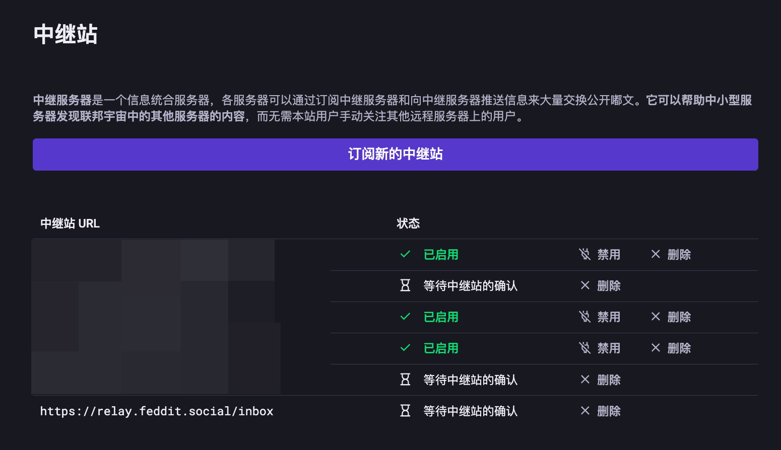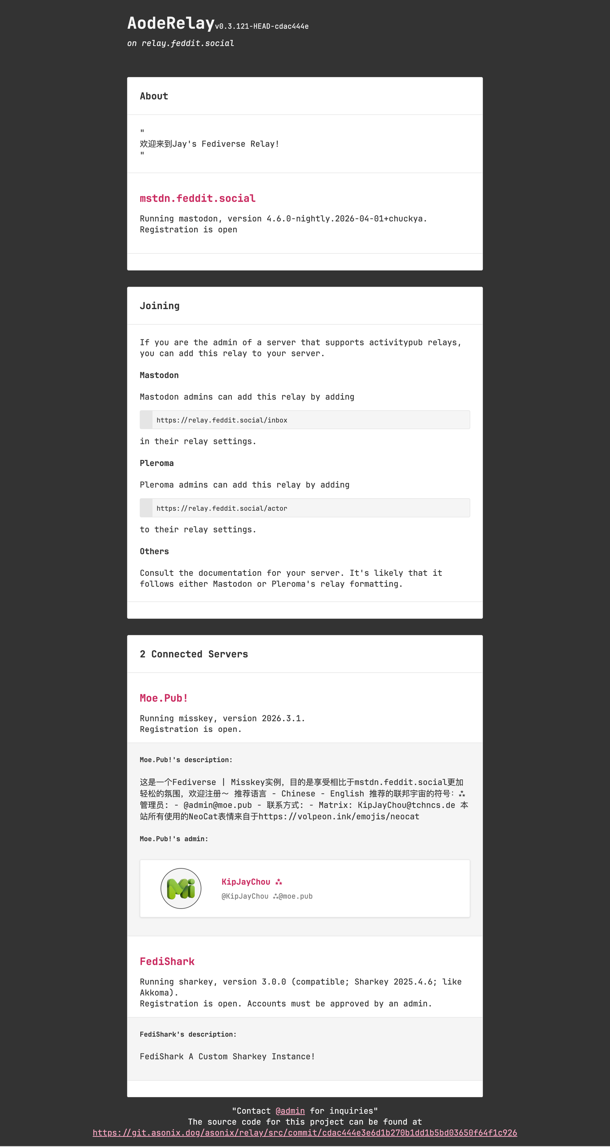 <p>也搭建了一个relay:<a href="https://relay.feddit.social" rel="nofollow"><span class="invisible">https://</span>relay.feddit.social</a> ,使用的是relay.infosec.exchange和relay.portal.gb0.dev同款的asonix/relay(或者说AodeRelay):<a href="https://git.asonix.dog/asonix/relay" rel="nofollow"><span class="invisible">https://</span>git.asonix.dog/asonix/relay</a></p><p>但是有点问题:比如两个实例没有图片www,还有我的主实例总显示" 等待中继站的确认",但是实际上已经加入了,fedishark.org是秒accept、moe.pub也是刷新就accept了((</p><p>还有其他的几个维护比较活跃的relay,接下来可以试试:</p><p><a href="https://github.com/amjiddader/activityPub-relay" rel="nofollow" class="ellipsis" title="github.com/amjiddader/activityPub-relay"><span class="invisible">https://</span><span class="ellipsis">github.com/amjiddader/activity</span><span class="invisible">Pub-relay</span></a><br><a href="https://github.com/yukimochi/Activity-Relay" rel="nofollow" class="ellipsis" title="github.com/yukimochi/Activity-Relay"><span class="invisible">https://</span><span class="ellipsis">github.com/yukimochi/Activity-</span><span class="invisible">Relay</span></a><br><a href="https://git.pleroma.social/pleroma/relay" rel="nofollow" class="ellipsis" title="git.pleroma.social/pleroma/relay"><span class="invisible">https://</span><span class="ellipsis">git.pleroma.social/pleroma/rel</span><span class="invisible">ay</span></a><br><a href="https://github.com/astro/buzzrelay" rel="nofollow"><span class="invisible">https://</span>github.com/astro/buzzrelay</a></p><p><a href="/tags/relay/" rel="tag">#Relay</a> <a href="/tags/fediverse/" rel="tag">#Fediverse</a> <a href="/tags/mastodon/" rel="tag">#Mastodon</a> <a href="/tags/selfhosted/" rel="tag">#Selfhosted</a></p>