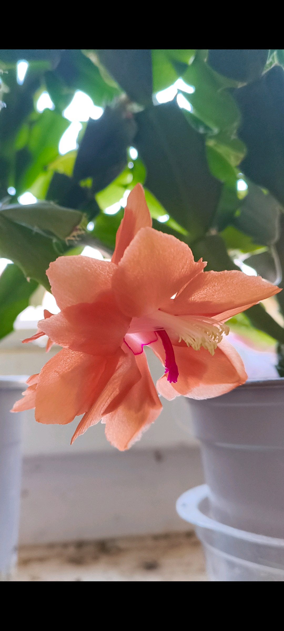 Eine lachsfarbene Blüte eines Weihnachtskaktus, welche sich geöffnet hat..Foto habe ich heute am 06.11.2025 gemacht..