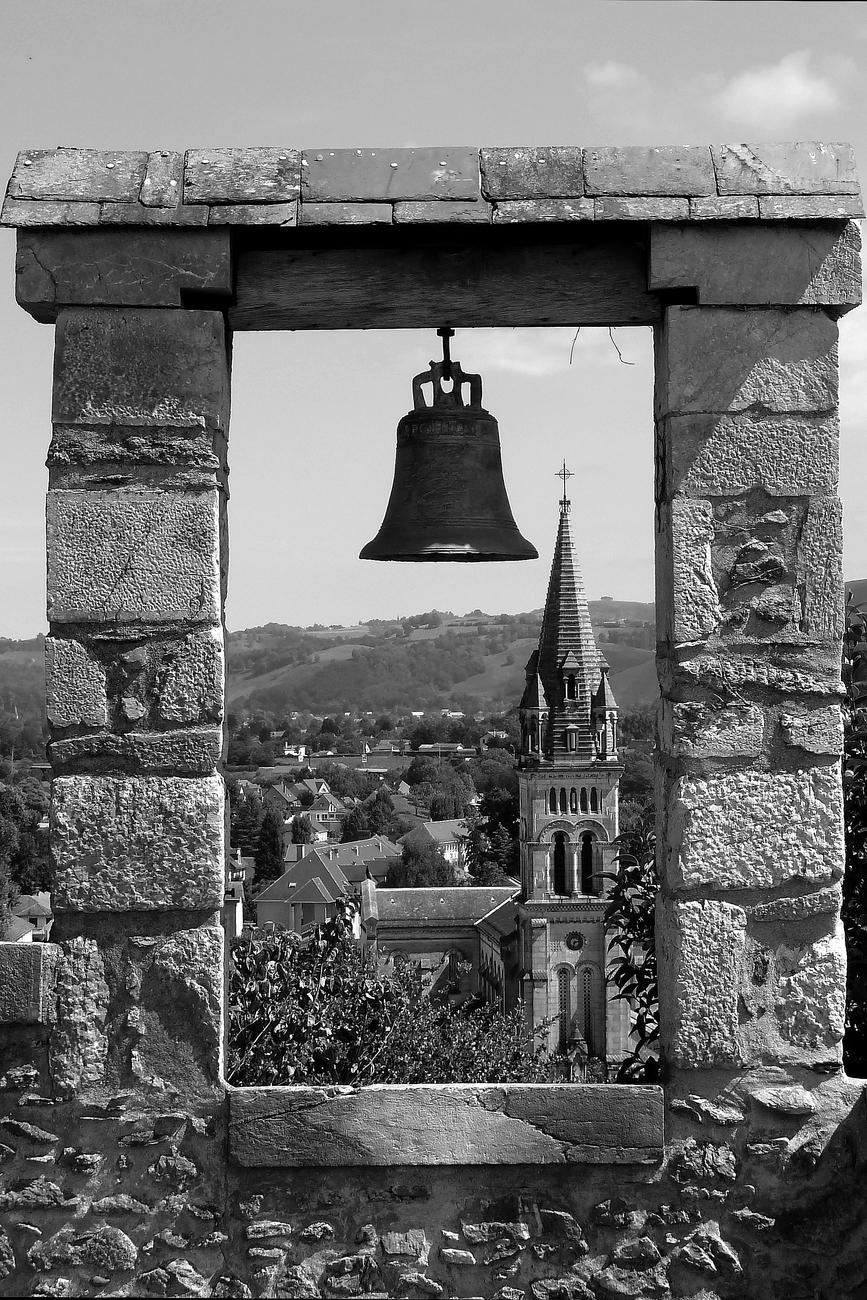 Sacré-Coeur de Lourdes church, seen through Lourdes Fortified castle bell, France.