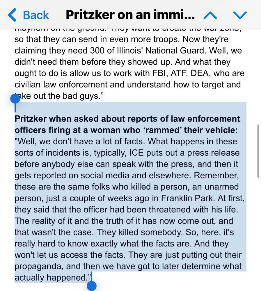 Pritzker pointing out that ICE lies first and immediately, knowing journalists will catch up later if at all.