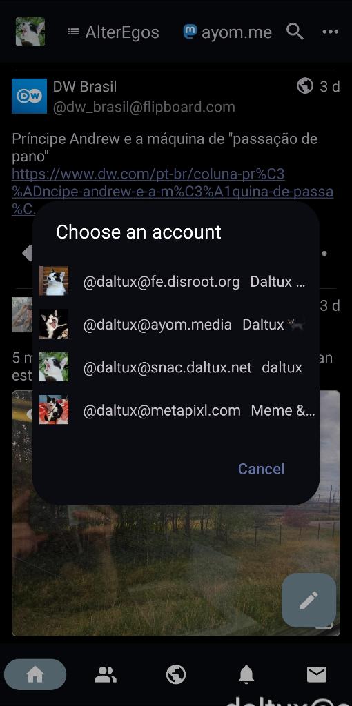 Isso está disponível de forma ágil ao pressionarmos longamente botões de responder, impulsionar, favoritar, bem como quando compartilhamos algo do Android com o Fedilab: ele pergunta com qual conta desejamos redigir a publicação.