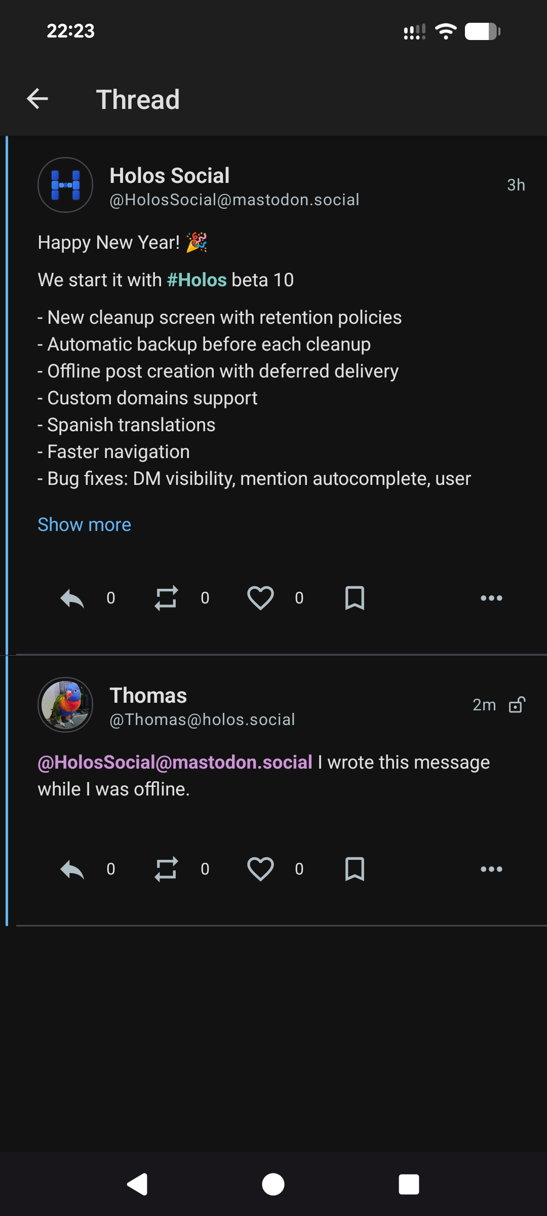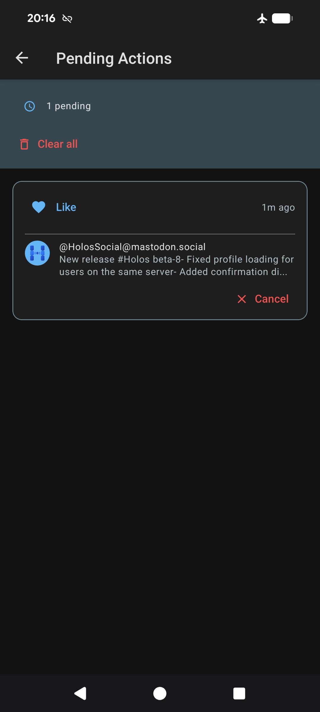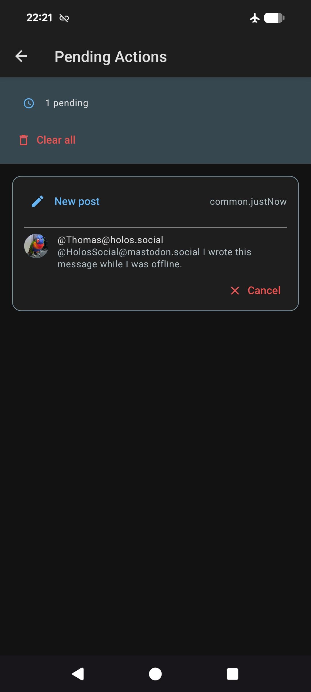 When you're offline, you can still read your timeline and interact with posts. Actions are queued and will be sent automatically once you're back online. You can check the pending actions queue anytime and cancel any action before it's sent. #Holos