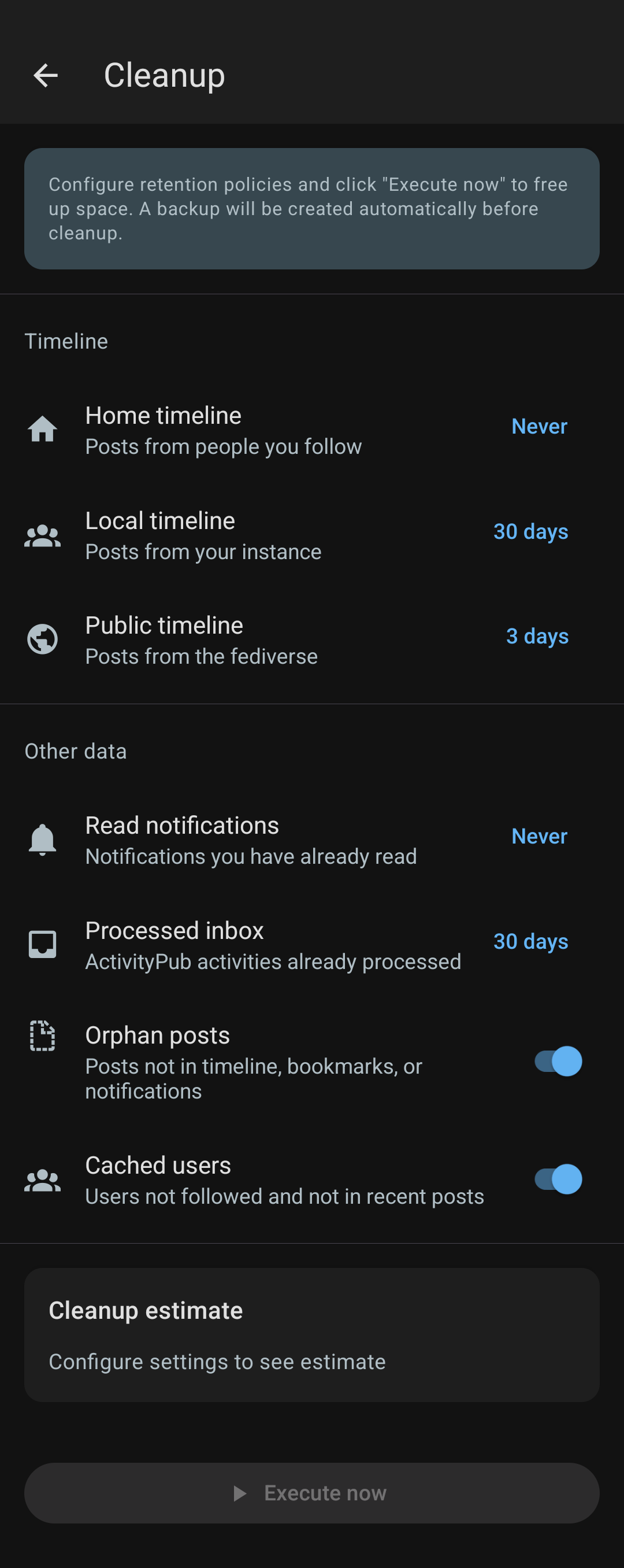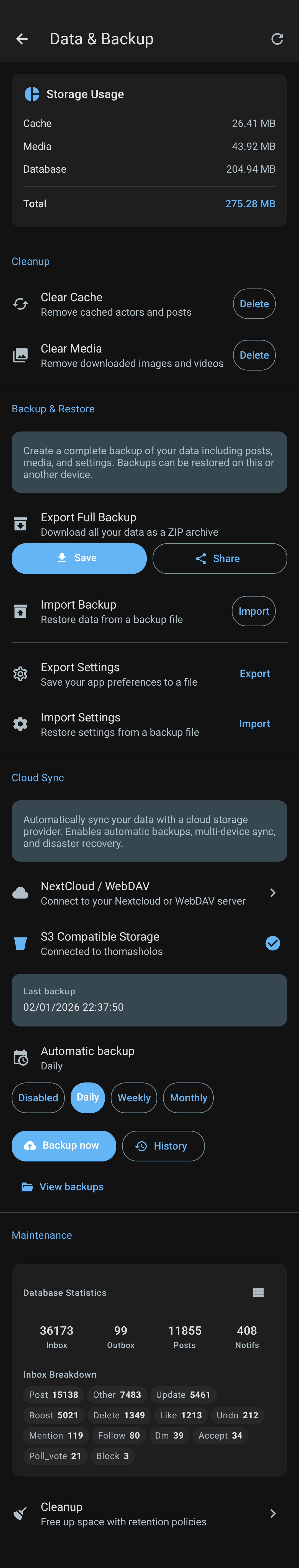 Running an ActivityPub server on your phone might sound complicated, but it doesn't have to be. You can just let it run with automatic maintenance, or dive into all the settings if that's your thing. Monitor storage, schedule backups, see what activities are taking up space, whatever level of control you want. Some might never open these screens, others check them daily. And that's totally fine. We made it automatic for everyone, but added all the tools for power users. That's your server #Holos