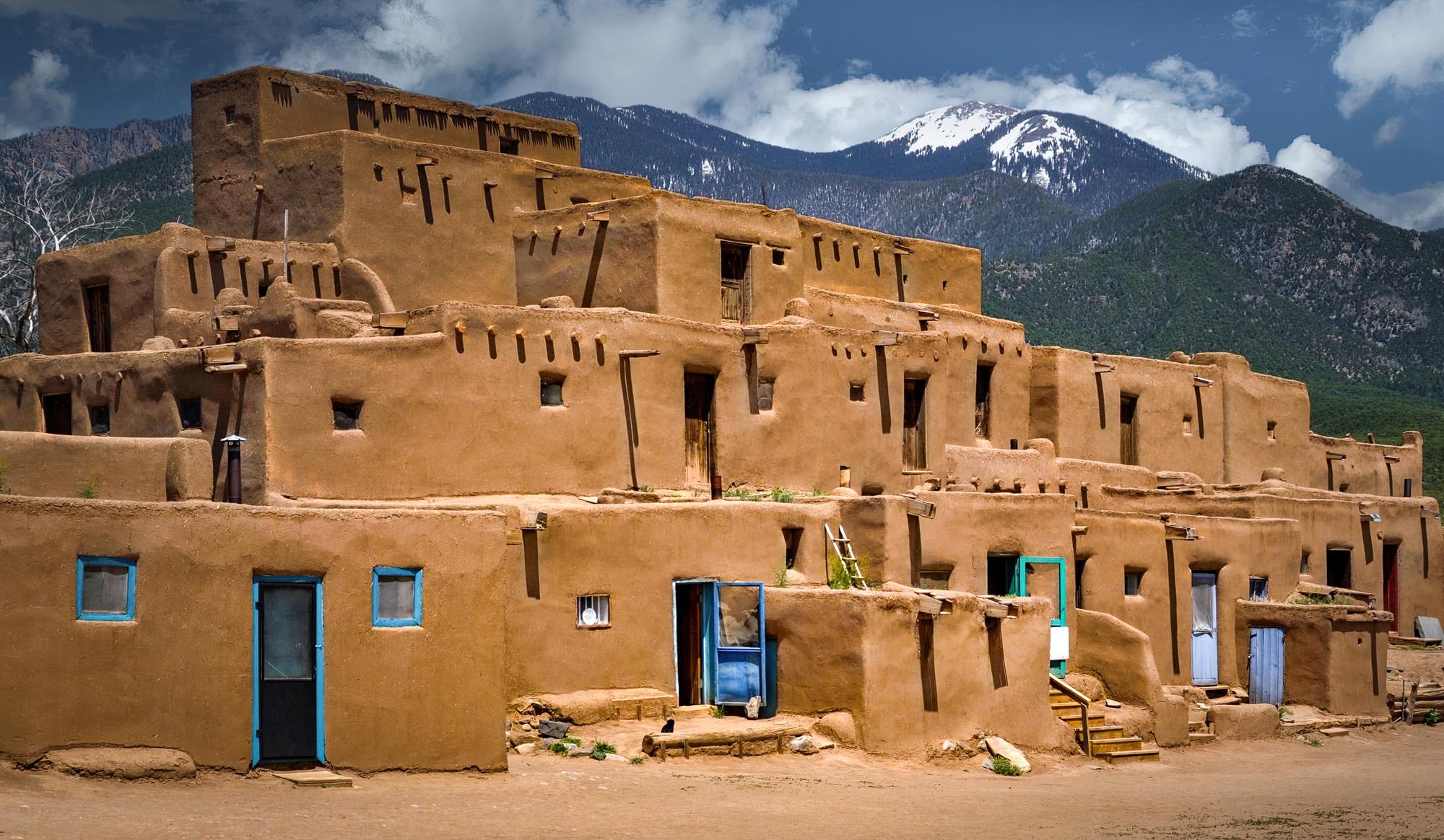 At the base of the Sangre de Cristo Mountains in northern New Mexico stands the Taos Pueblo, a UNESCO World Heritage Site and one of the oldest continuously inhabited communities in the United States, over 1000 years old. Built from adobe, these multi-storied homes reflect centuries of tradition and resilience of the Taos people.