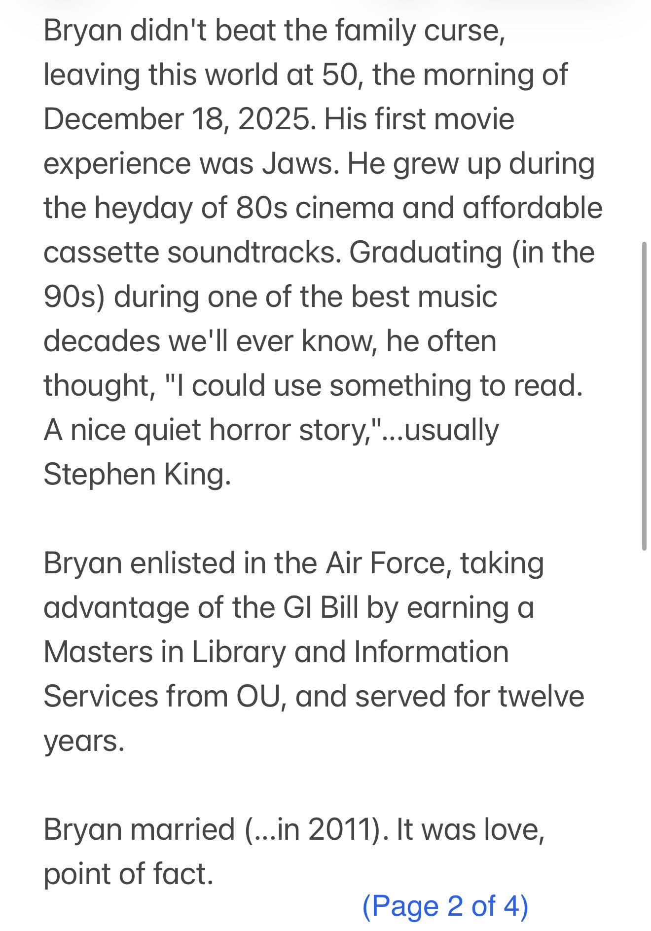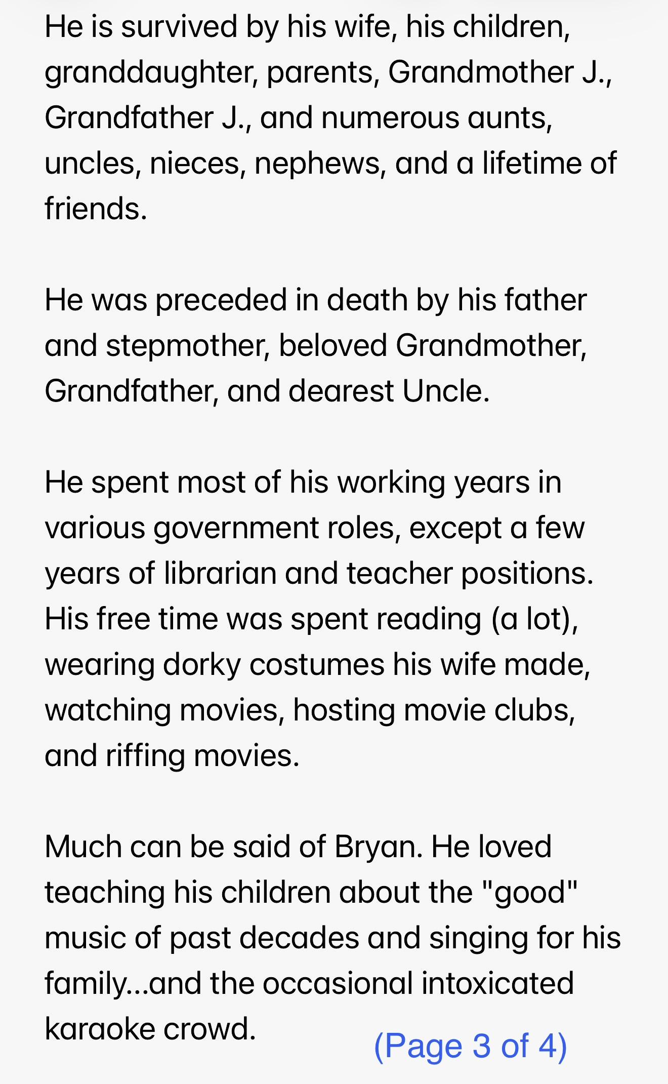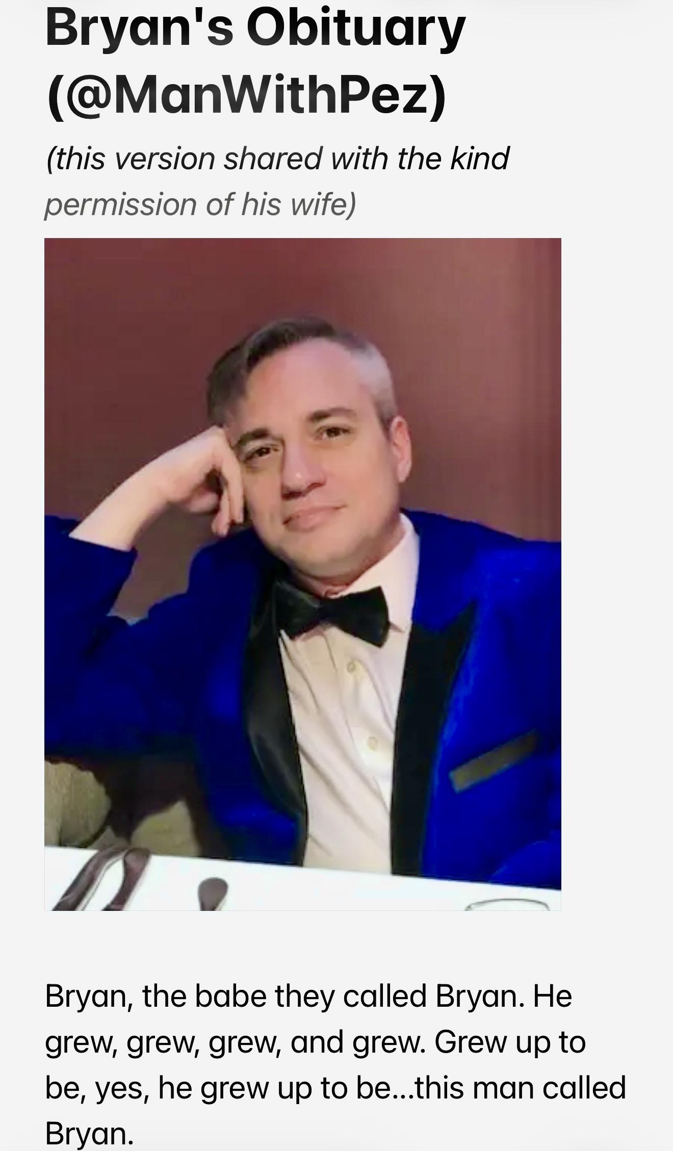 #RIPManWithPez π―οΈ Some of you have asked to see Bryan's obituary, which quotes some of your comments -- so yes, your words have meaning to his wife and daughter. β₯οΈ